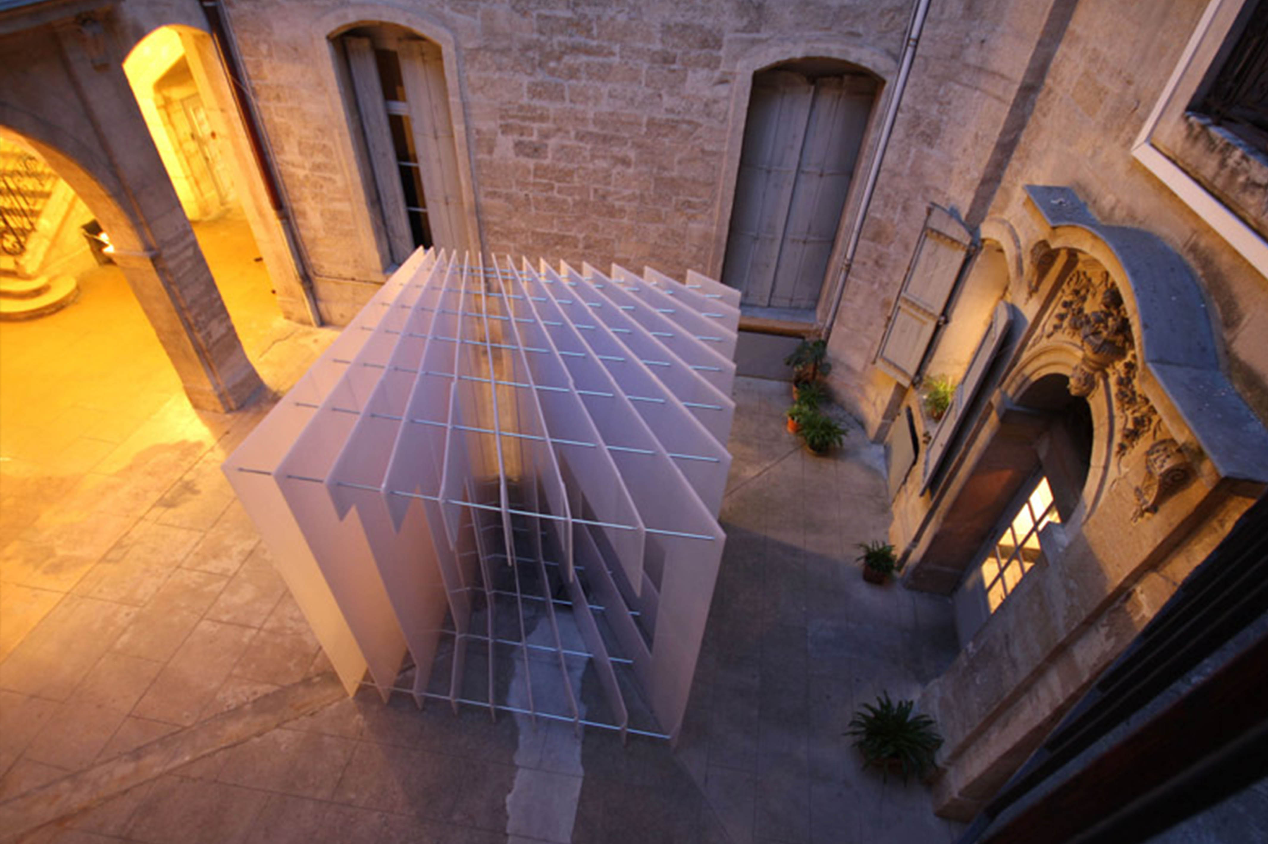 Dutch architecture office Paul Scales attempted to explore different views of a courtyard which was the respective site of this temporary installation. The simple cube design of the structure is made from polycarbonate sheets which gradually reveals multiple framed viewpoints. This installation serves as a good example of sheathing and framework together being used as a single entity making the structure stand.