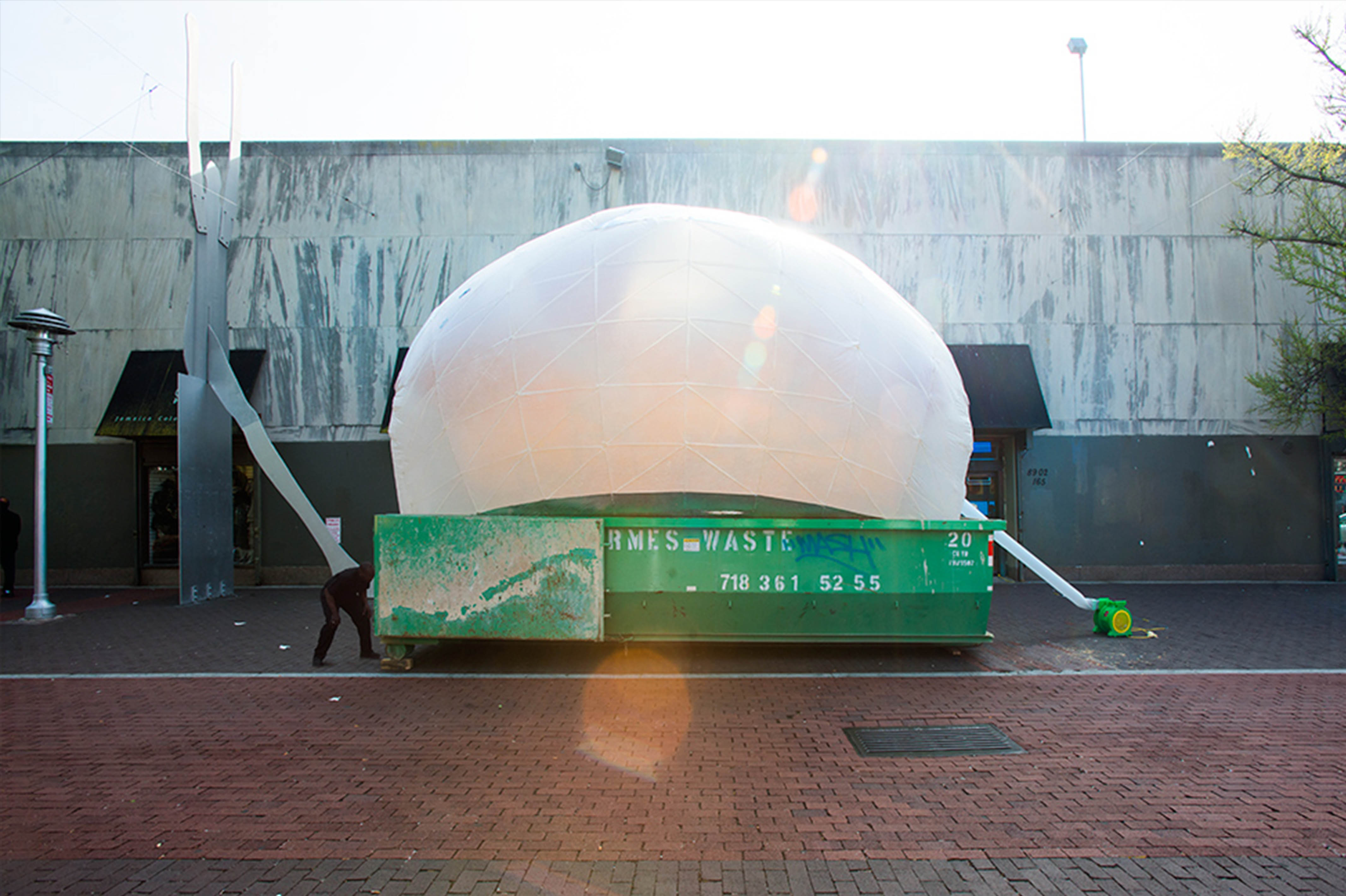 The dumpsters consist of an inflatable two-layered membrane made from polyethene and mylar film, which allows views from both in and out towards the street.