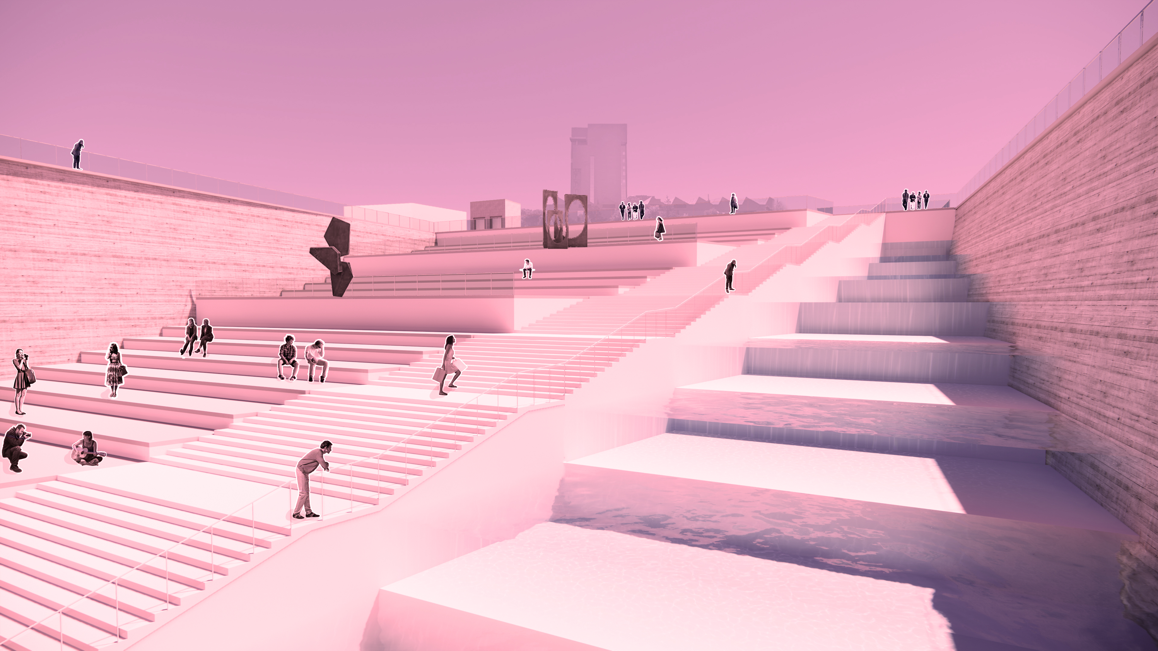 The semi-open pavilion is a place for concerts and shows, as well as a place to enter the new building of the Logan Art Center via vertical access. Which eventually leads to the viewing area, which is called the eye of the new Logan building, and to the basement of the complex, which is the amphitheater.