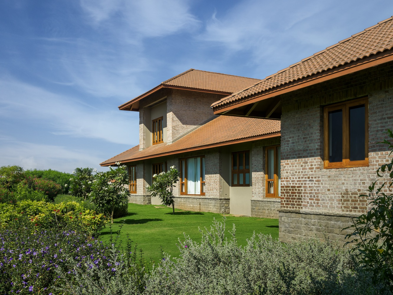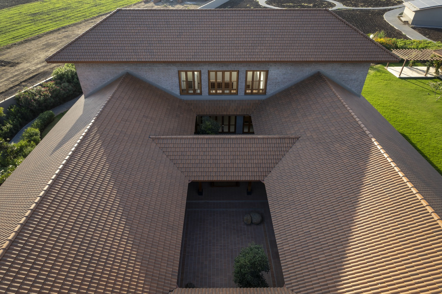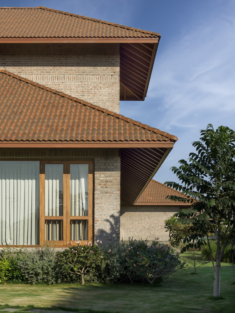 The House with Two Courts stands as a beacon of how modern architectural design can pay homage to traditional Indian vernacular styles. By integrating local materials like stone and brick, the project honors the earthy essence of its rural setting. The use of sloping roofs not only adds a new dimension to the village skyline but also resonates with the architectural language of the region, showcasing a seamless blend of old and new.