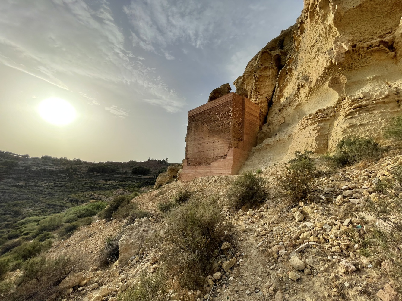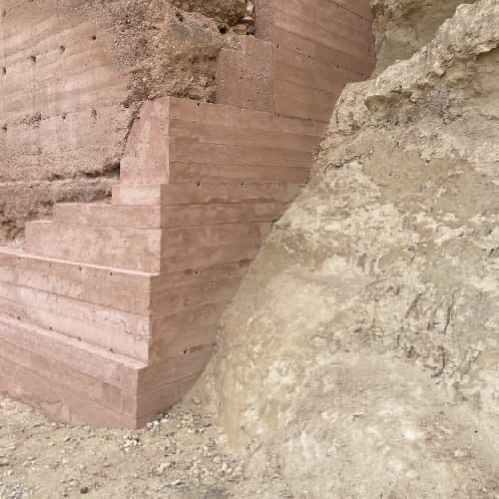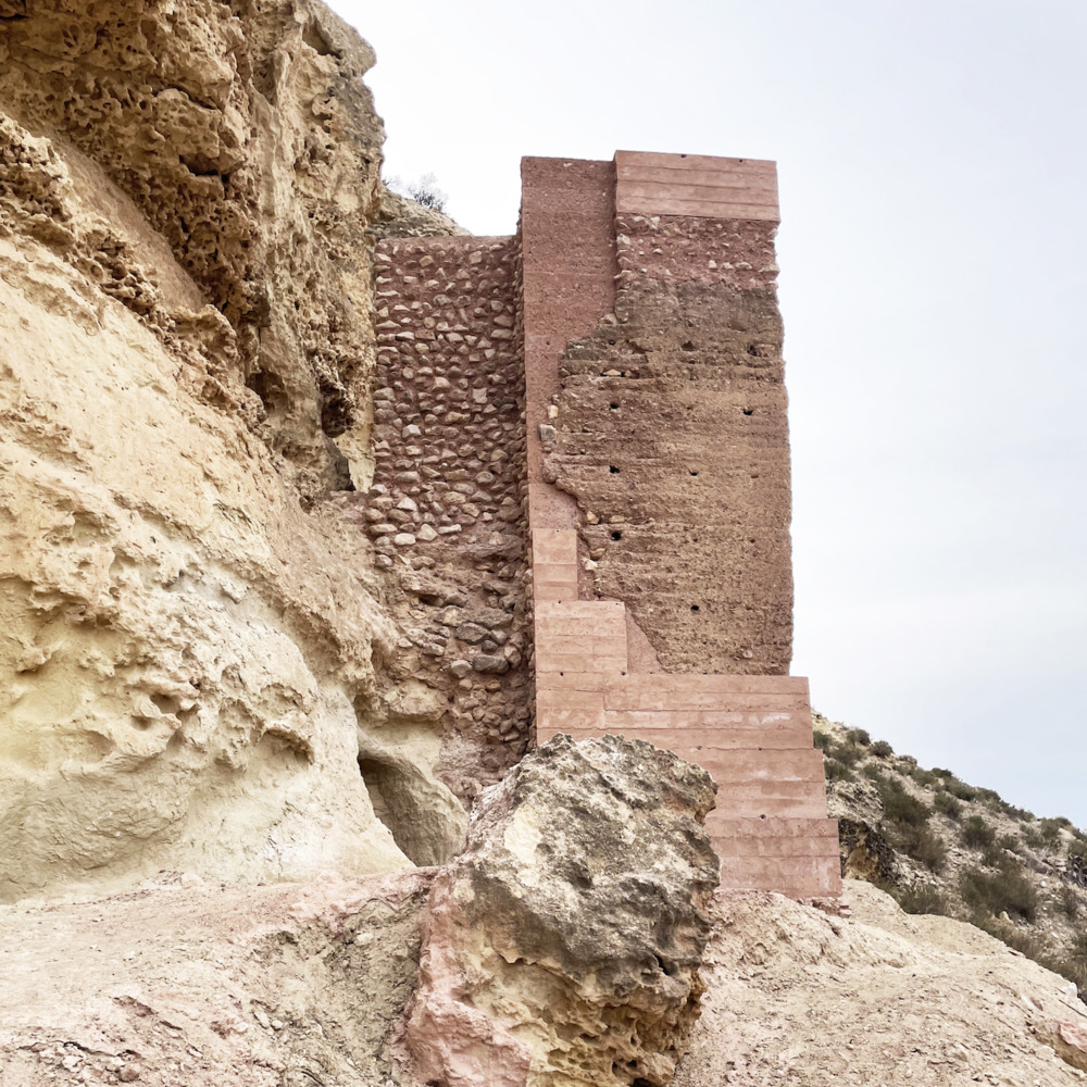 The restoration project focuses on harmonizing the tower with its natural surroundings. The reddish tones of the reconstructed walls camouflage seamlessly with the landscape, making the tower appear as though it naturally rises from the earth.