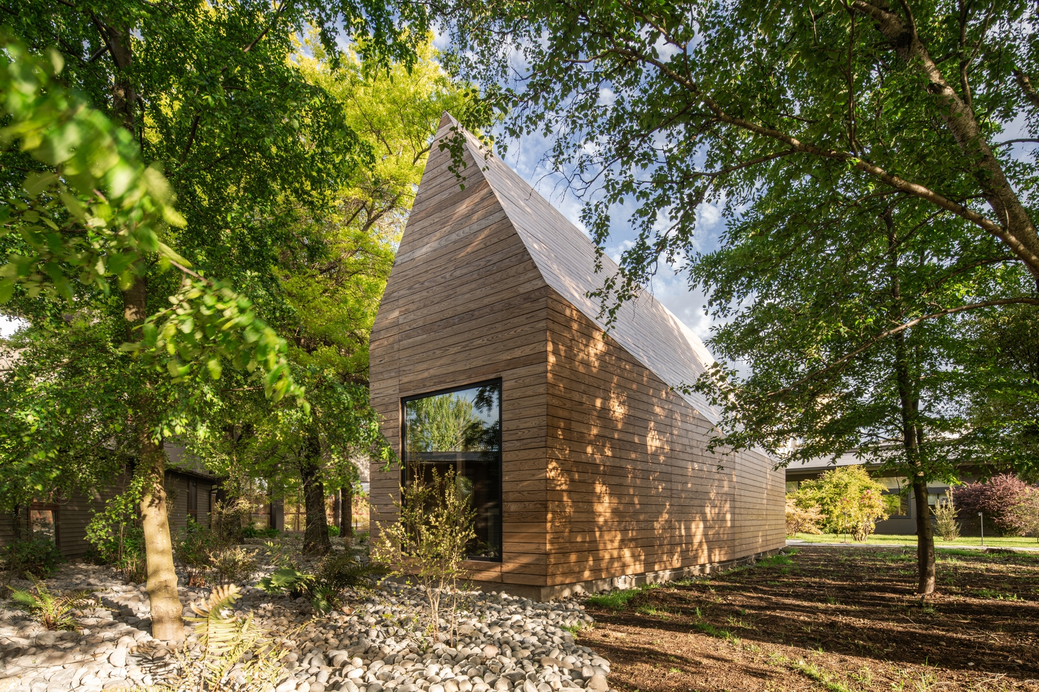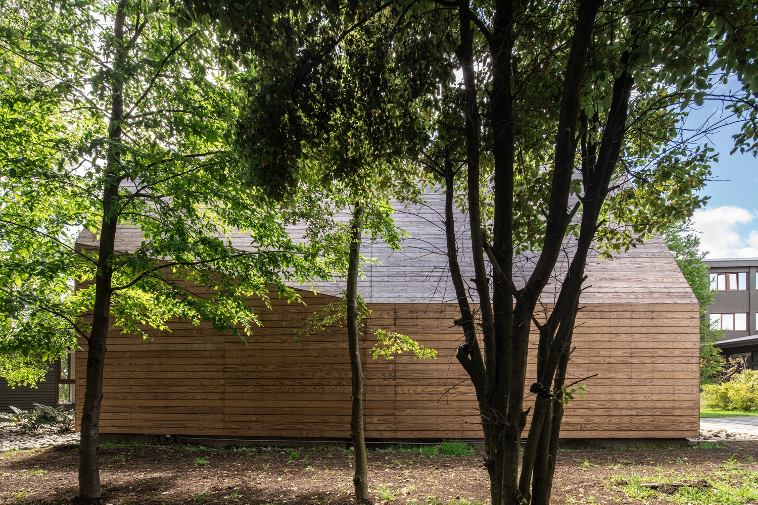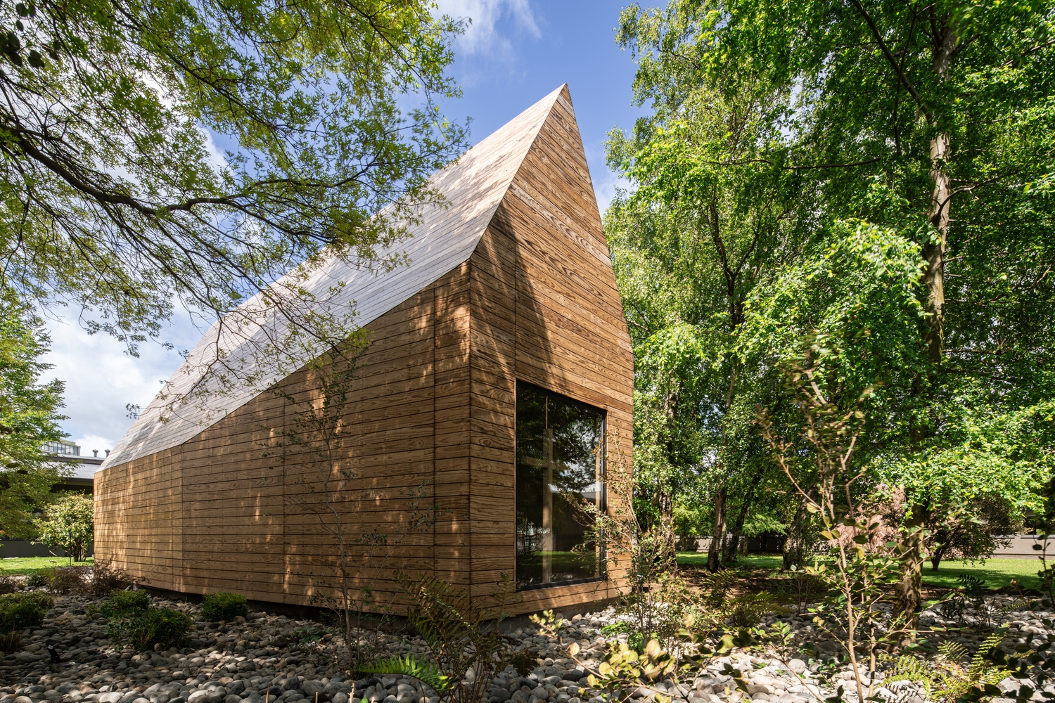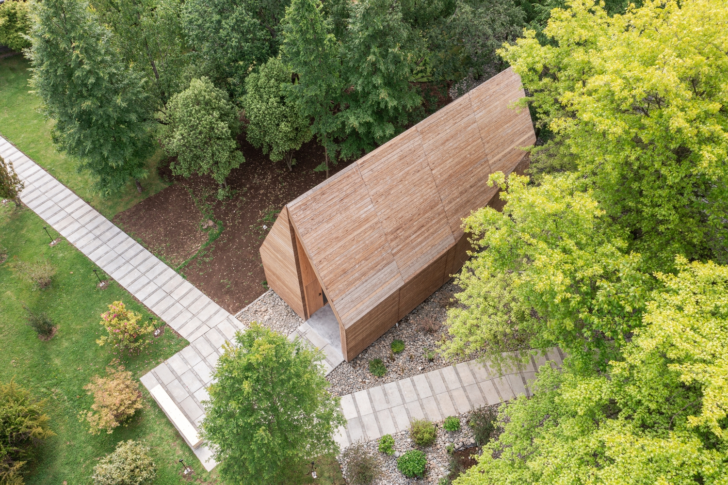 The chapel's exterior wood cladding harmonizes with its natural surroundings, reinforcing the project's commitment to sustainability and ecological sensitivity. This integration speaks volumes about the architects' vision of creating a space that respects and reflects its environment.