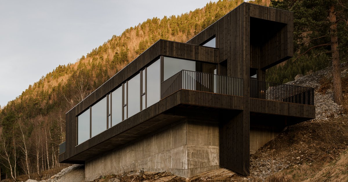 A hillside Norwegian holiday home that follows natural terrain, using local materials and subtle volumes to frame fjord views and blend with landscape.