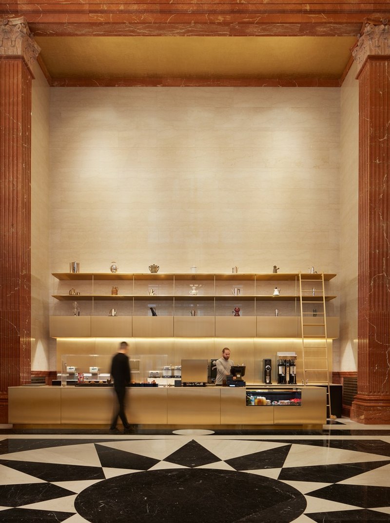 190 South LaSalle lobby renovation by Norman Kelley features a brass and marble amphitheater with immersive audio, seating, café, and postmodern design.