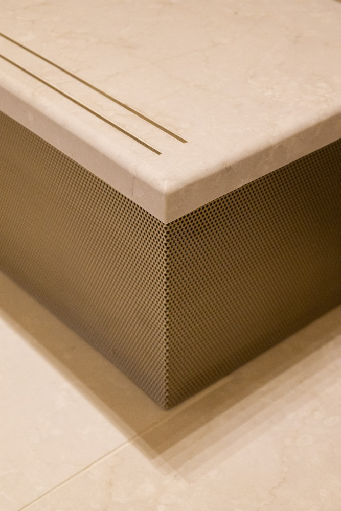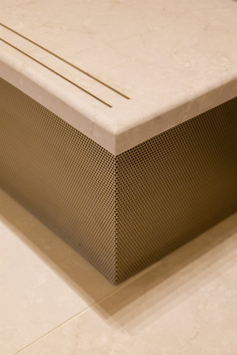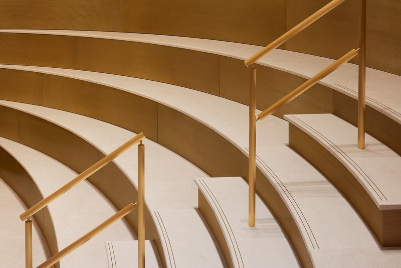 At the heart of the renovation lies a striking semicircular amphitheater, measuring 12 feet in height and 27 feet in diameter. This brass and marble structure replaces a traditional marble security desk in the north apse of the lobby, creating a responsive musical instrument.
