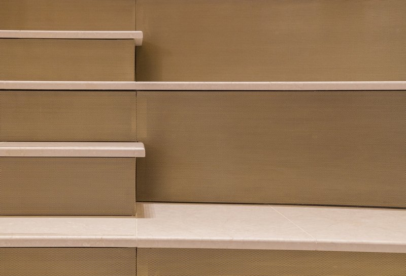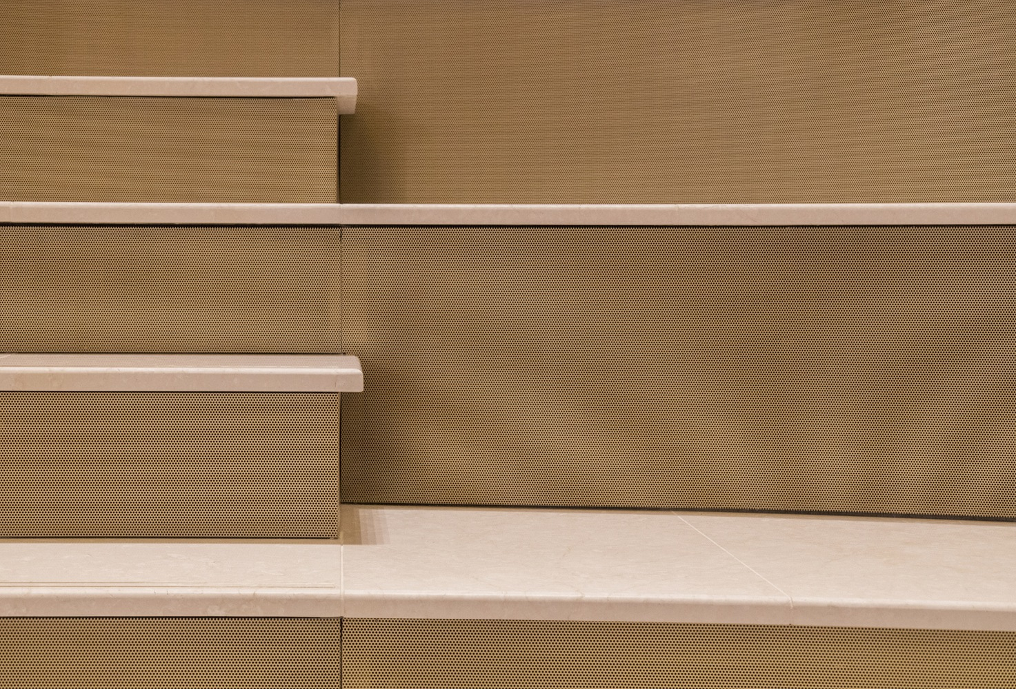 The audio installation, developed in collaboration with iart (media architecture studio) and sound scenographer Idee und Klang, features 81 light sensors and 3 motion sensors hidden behind perforated brass panels. Once activated, the amphitheater produces a complex musical score involving 15 instruments, 4 tempos, and 7 keys and scales, transmitted through 8 of the 91 strategically placed speakers.