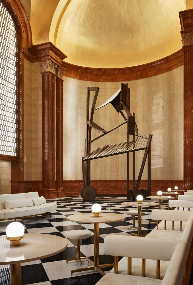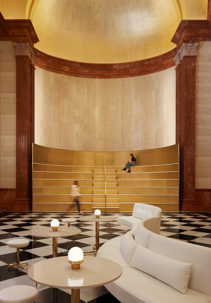 - Postmodern Vaulted Ceiling: 50-foot-tall gold leaf vault preserved and enhanced.