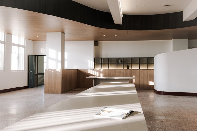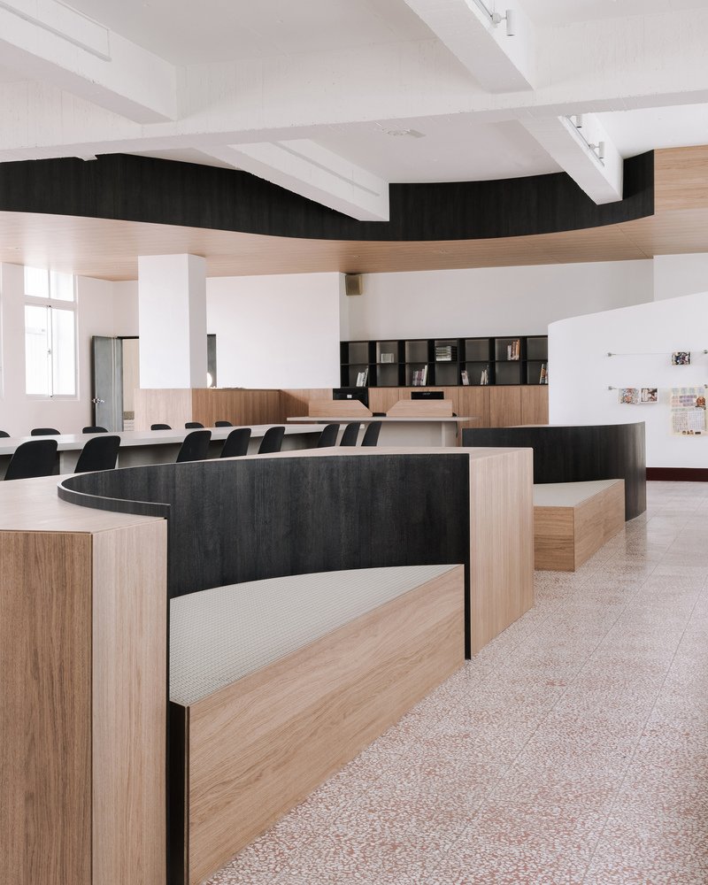 Respecting the school’s historical context, the architects preserved the original red terrazzo flooring and exposed the raw ceiling slab by removing the previous dropped ceiling. This gesture reveals the building’s structure while bringing height and openness to the space.