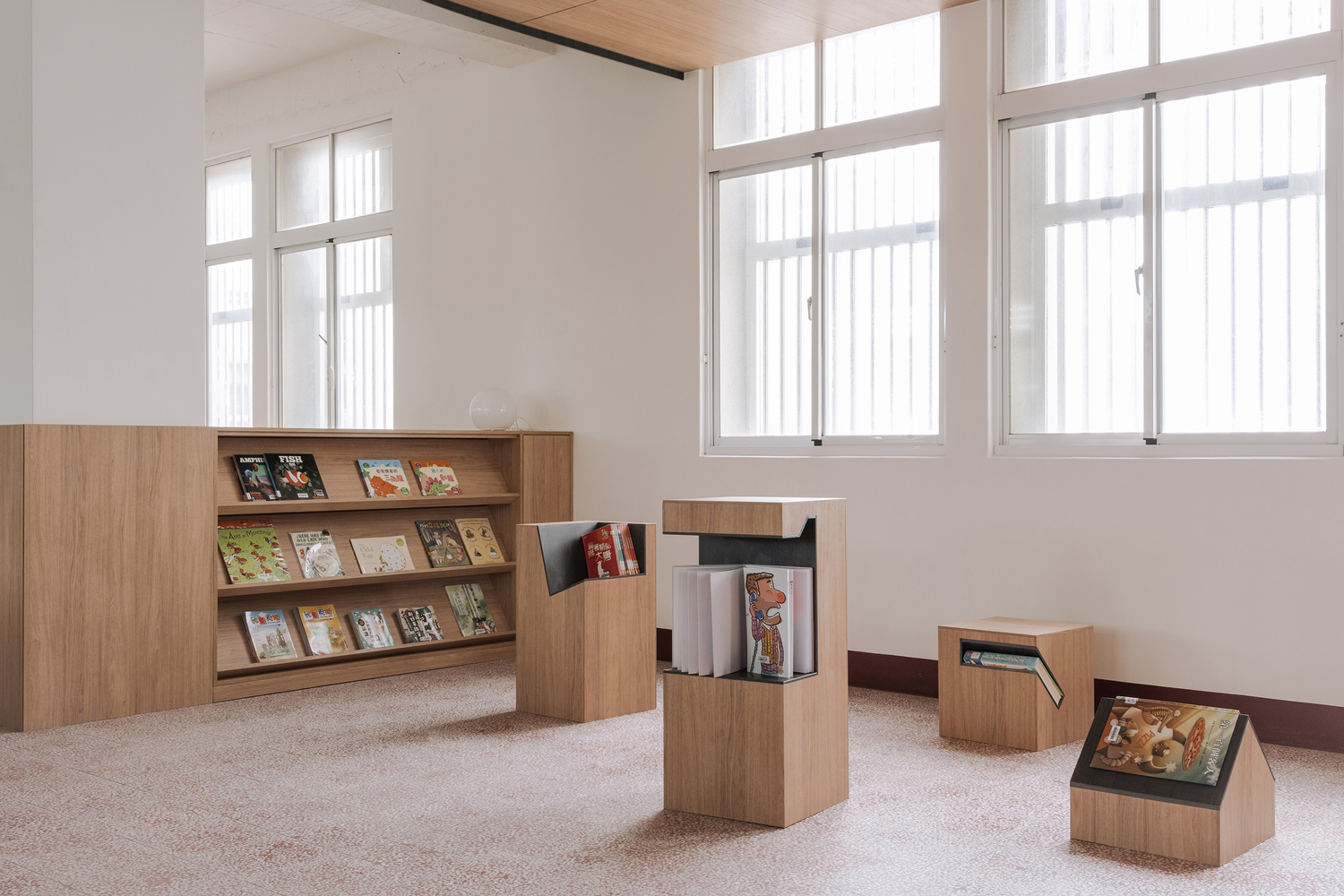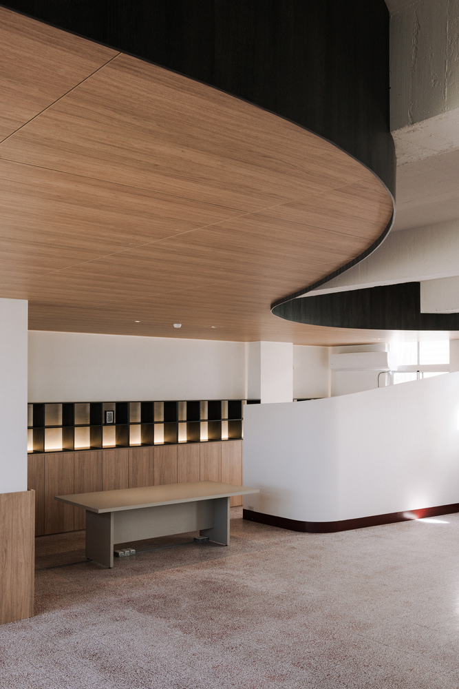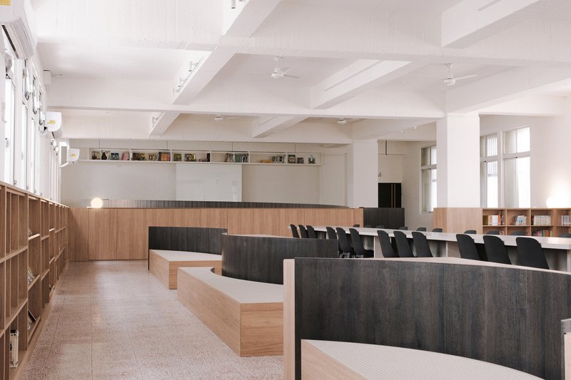 The contrast between wood tones, white volumes, and preserved red terrazzo flooring sets a calm and elegant tone, resonating with the quietness embedded in calligraphic practice.