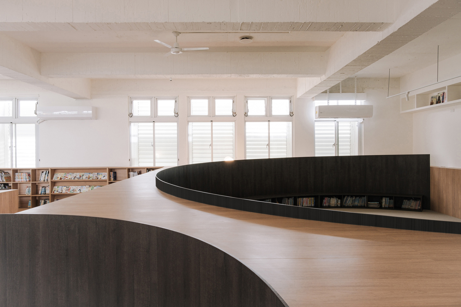Toward the rear of the space, a multipurpose stage accommodates storytelling, group activities, and school performances, seamlessly integrated into the overall flow—like another brushstroke in a larger composition.