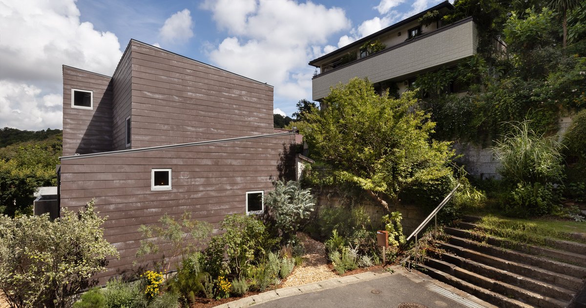 A unique cat-friendly home in Kamakura, blending innovative architecture with feline needs, featuring a spiral staircase and lush landscaping.