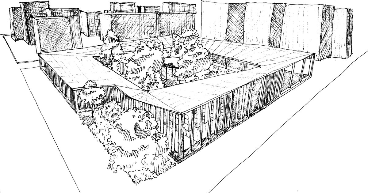The program specifies a library, an exposition, and a conference hall. The first is the place where knowledge is stored and made freely accessible. Hence, it must be opened towards the street, so that the view of books and peoples reading them prompt others to enter. Inside, the view of nature and the filtration of light through the leaves offer a peaceful and warm-lighted environment for studying on the south-oriented tables. Moreover, the passageway gives the opportunity to find the perfect reading spot, once again surrounded by nature and light.