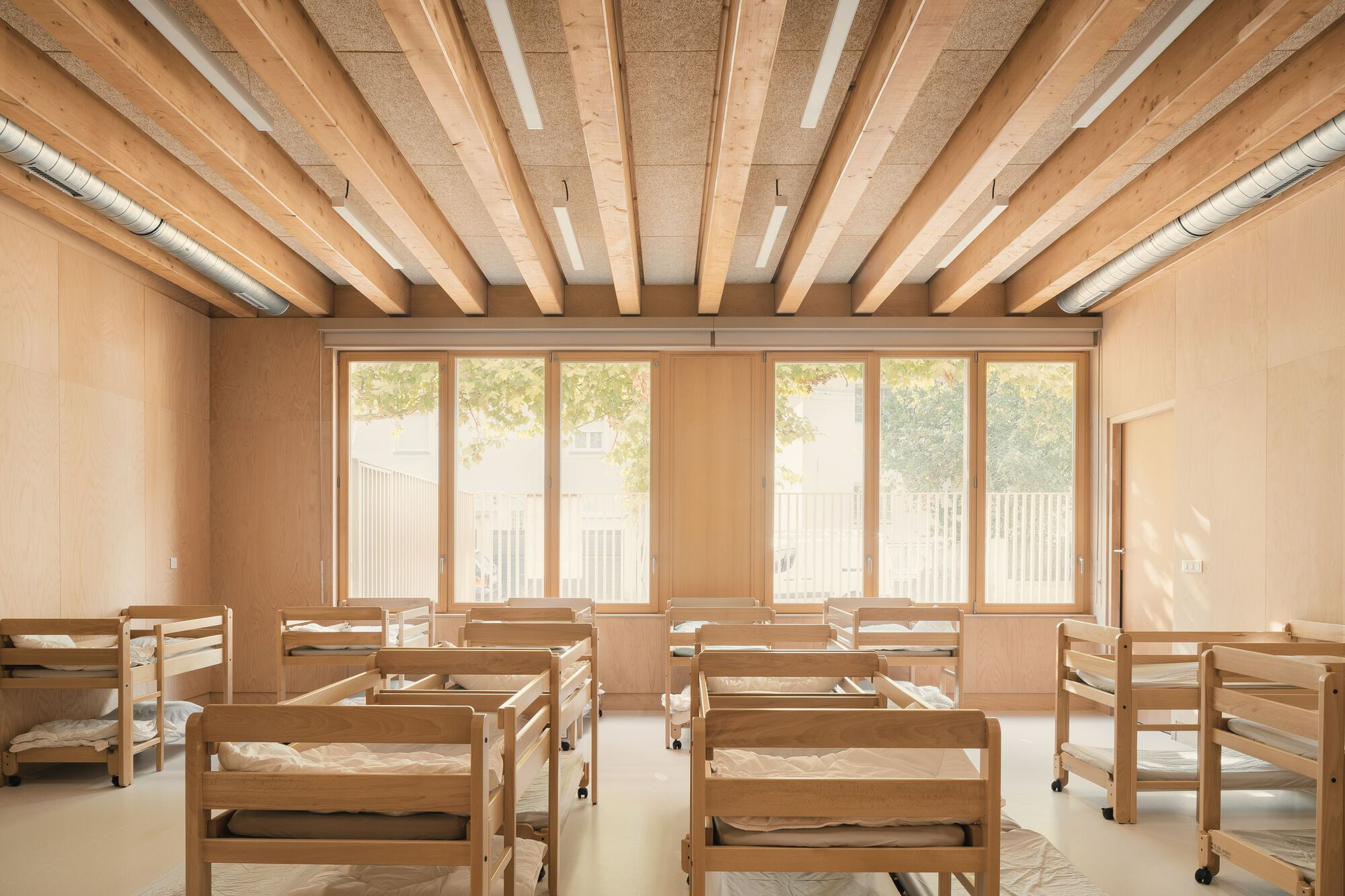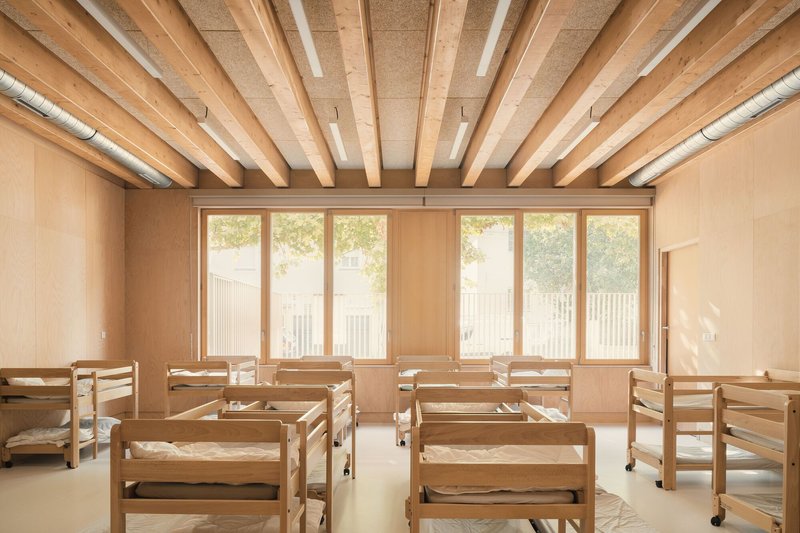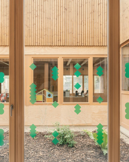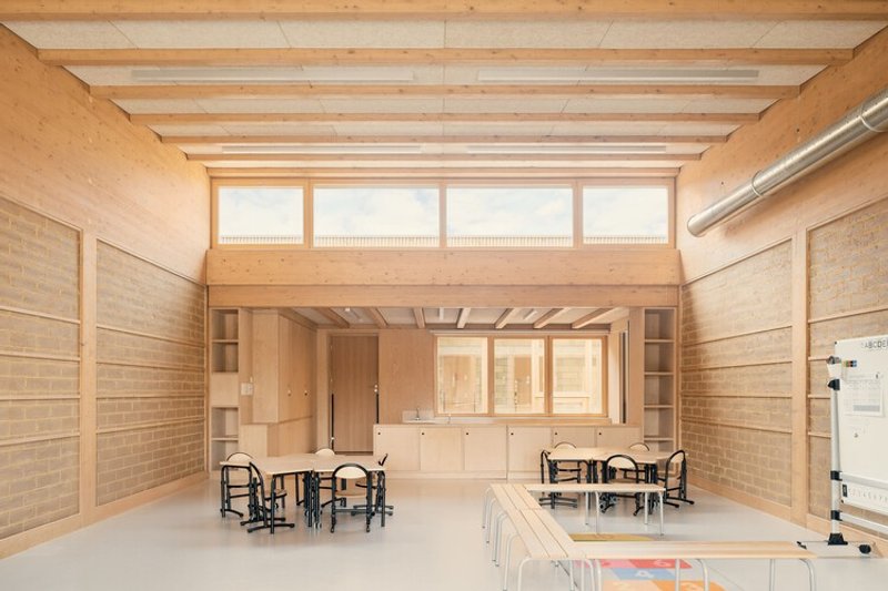 Each classroom is dual-aspect, benefiting from abundant natural light and cross-ventilation. To the north, patios bring in soft daylight and frame calm, shared wooden spaces between adjacent classrooms. To the south, classrooms open directly onto the playground, supporting more collective and active learning modes.