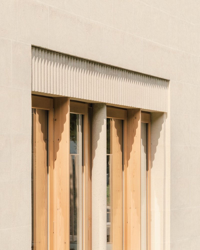 Environmental commitment is central to the project and deliberately expressed through material choices and building performance. Load-bearing stone façades sourced from the Bonneuil-en-Valois quarry—less than 60 km from the site—provide strong thermal inertia while giving the building a sculptural, enduring presence.