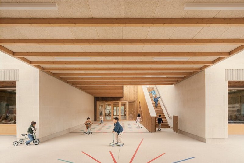 At the heart of the complex lies a generous lobby oriented north–south, connecting the entrance directly to the playground. Far from being a simple circulation space, this lobby functions as a genuine living room for the school—a place for learning, exchange, and informal gathering.