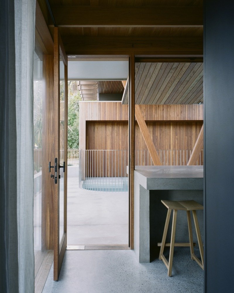 Sustainability is a key component of the Bangalow Road House. The home makes use of locally sourced, raw materials to reduce carbon emissions associated with transportation. The primary material is a native hardwood that encases the structure and extends into the interior, transitioning from a rich hue in the interior to a silver-grey patina on the exterior. This use of natural materials helps anchor the home to its location, creating a deep sense of place and a seamless connection between the inside and outside.