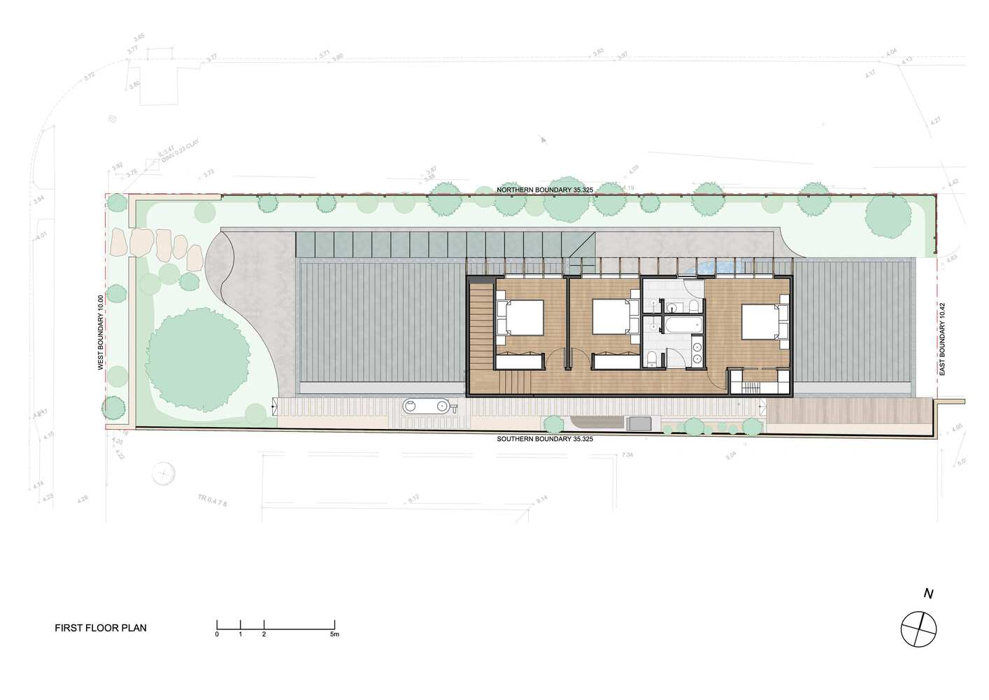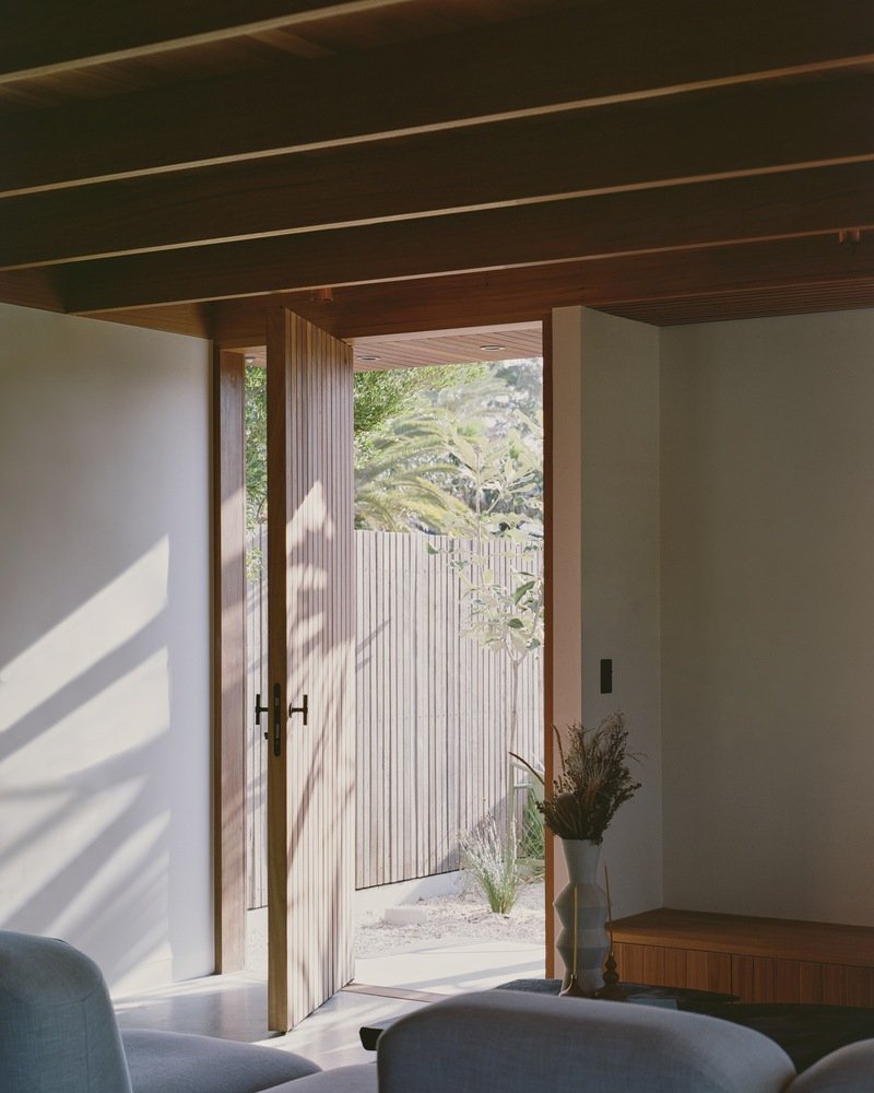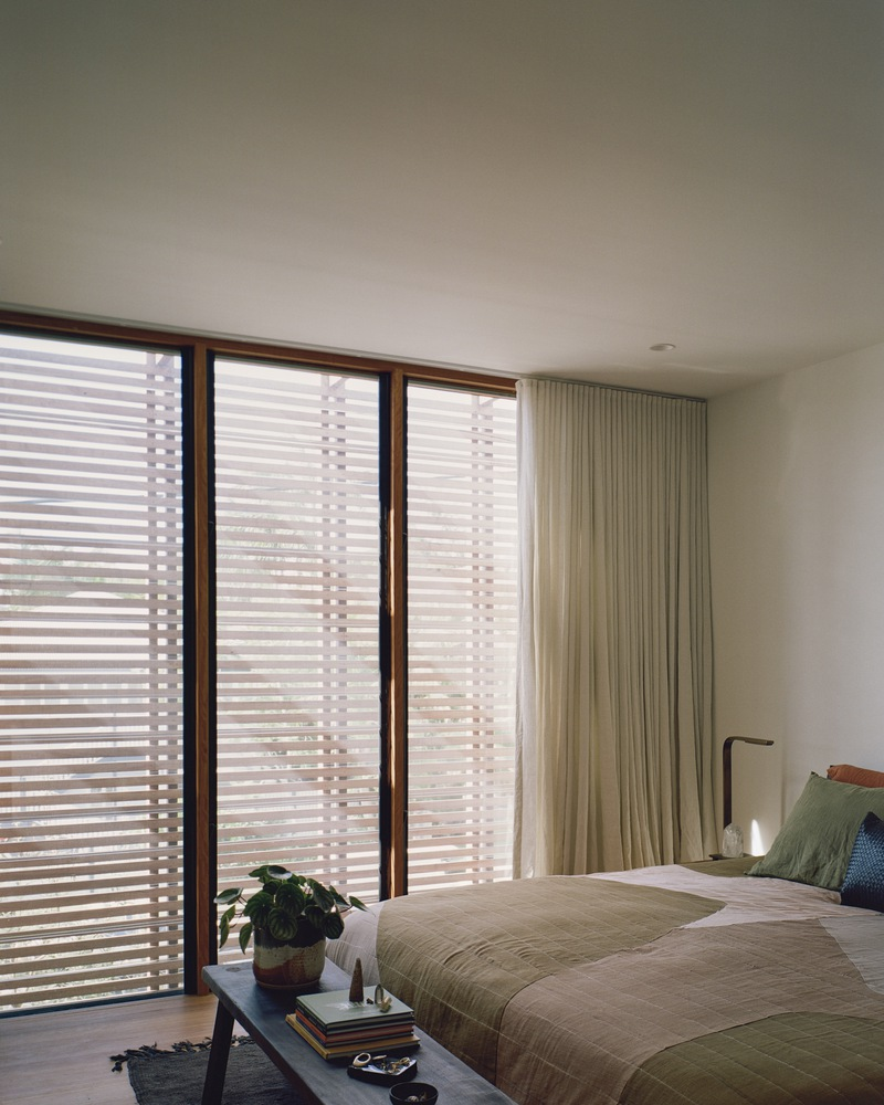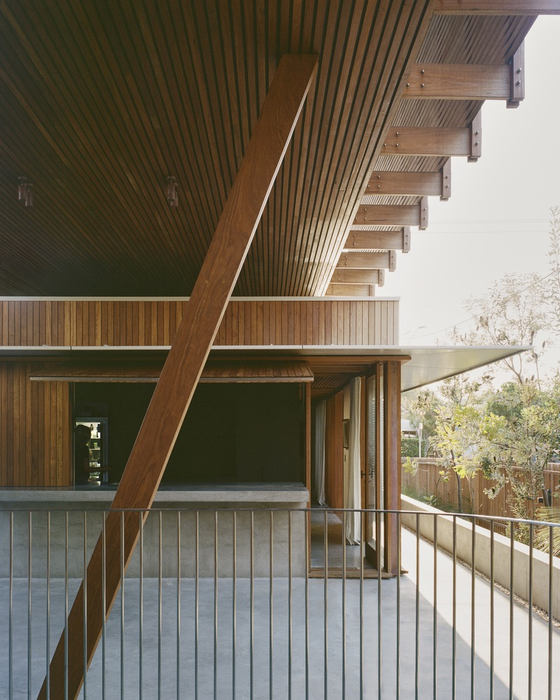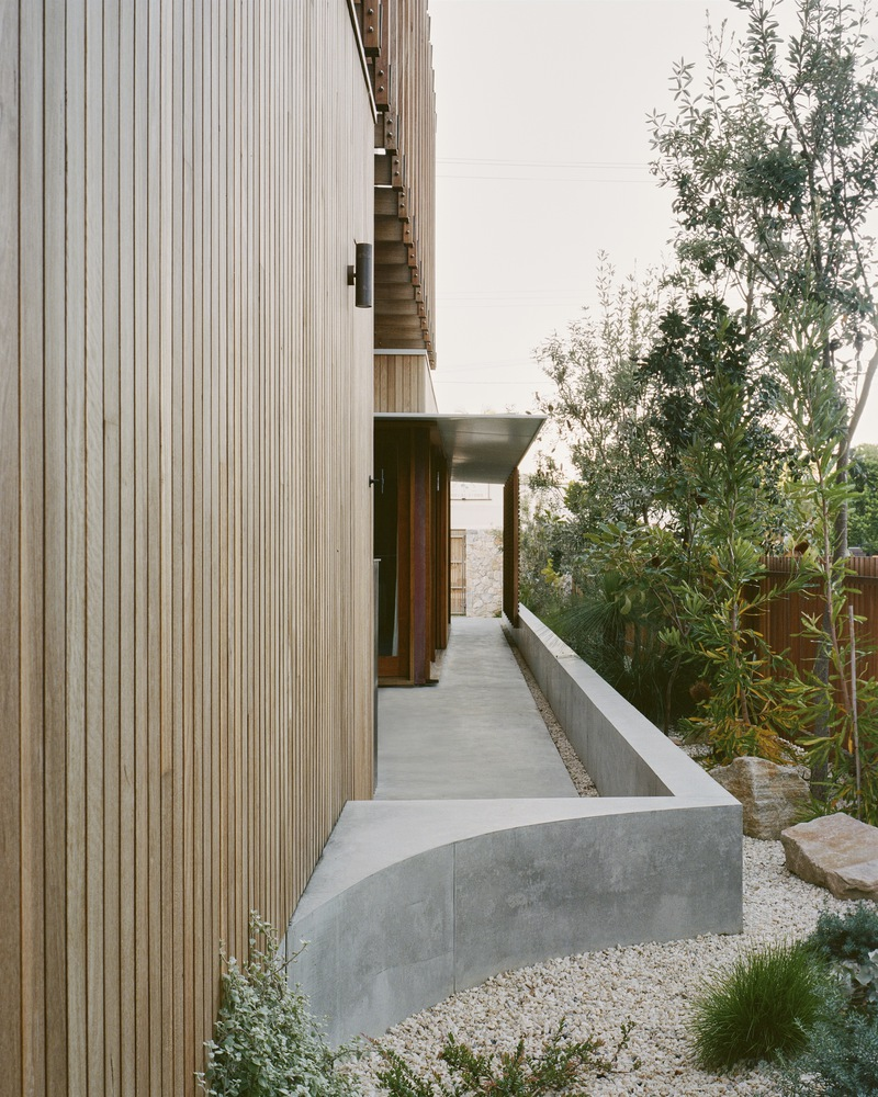 The layered timber screens also create a unique spatial experience within the house, with shifting patterns of dappled light that change throughout the day. These screens give the home a poetic quality, with vistas of the street, gardens, and surrounding site framed differently from every angle. This dynamic interplay between light and shadow brings a heightened sensitivity to the way occupants interact with their home, encouraging curiosity and engagement with the environment.