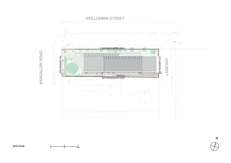 A central courtyard is the heart of the Bangalow Road House, providing an important spatial and functional feature. This outdoor area, enclosed by the building’s form, fosters a flow between openness and privacy, a vital aspect of the design, especially given the proximity to a busy street. When the space is opened to the courtyard, the home creates a welcoming, social atmosphere, while solid openings can be closed off to ensure privacy and shield the occupants from the street view. The design of the courtyard, combined with a thoughtful arrangement of volumes, offers a dynamic and private living experience despite the house's small size.