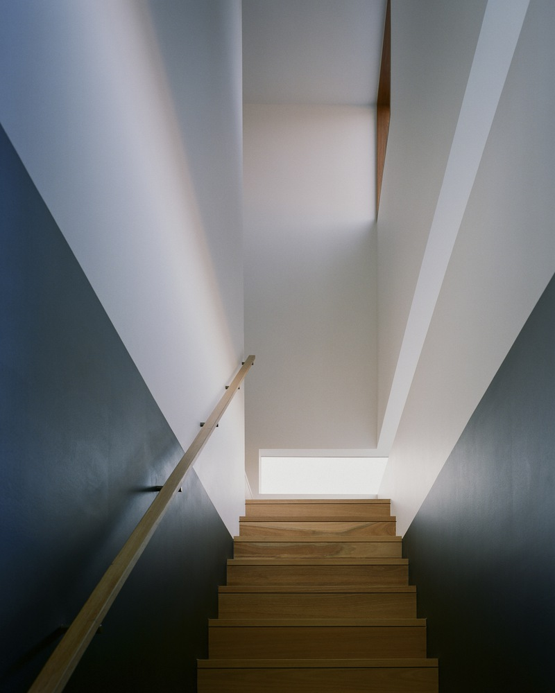 The house's design maximizes the use of the site’s limited space while respecting strict height and side boundary constraints. The structure is composed of three interrelated volumes, each serving different functions. The upper volume houses the private areas, including all the bedrooms, while the two lower volumes accommodate the garage and the living spaces. The home’s two-storey form deviates from conventional designs by creating a visual separation between the volumes, allowing the upper volume to appear as if it floats above the lower ones. This configuration not only adheres to prescribed site limitations but also minimizes the perceived scale of the building, ensuring it integrates harmoniously with the surrounding neighborhood.