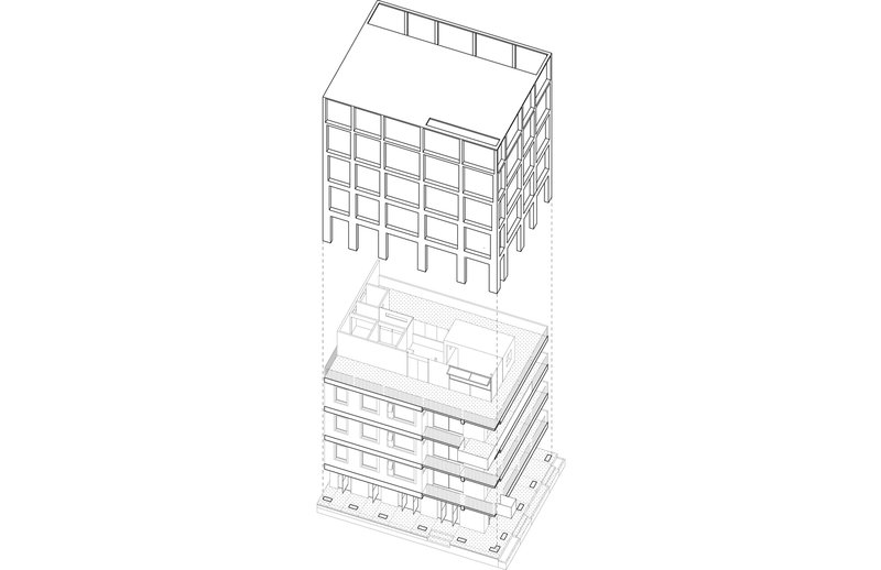 One of the most notable aspects of this adaptive reuse project is the externalization of structural reinforcement. Buttress columns were added to the façade, reinforcing the building’s structural integrity while forming a new architectural pattern. This "visible reinforcement" not only meets safety standards but also makes the process an integral part of the building's identity, blending old and new seamlessly. The choice to use structural buttressing as a visible element rather than traditional surface-level interventions (such as painting or replacing windows) reflects the building's evolving role in the urban environment.