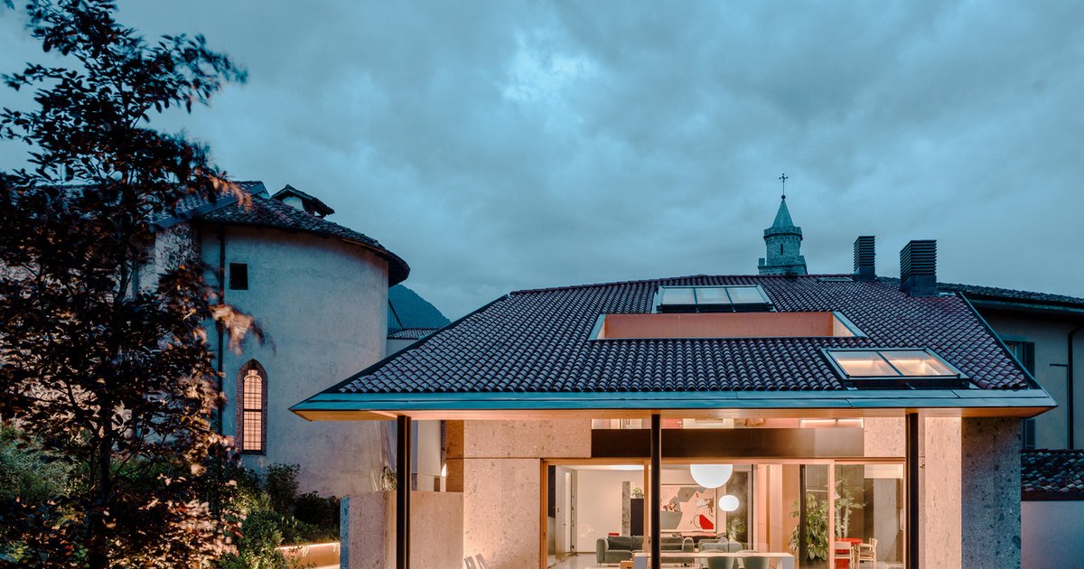 The main three-story apartment faces inward, emphasizing a vertical courtyard that connects the home’s interior spaces while allowing abundant natural light. The residence also includes a smaller, two-story apartment overlooking the piazza, enhancing spatial complexity and functionality. The interplay of vertical light and horizontal views traverses the large sloping roof, linking terraces, porticos, and interior volumes in a dynamic spatial choreography.