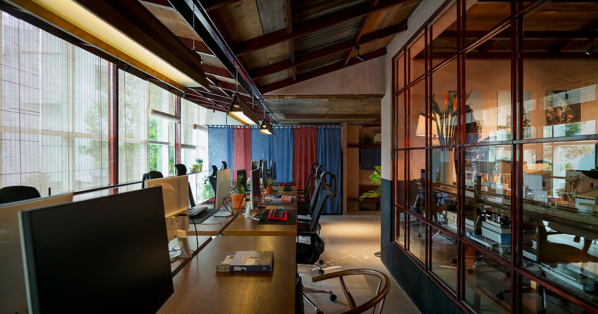 The use of bamboo blinds plays a central role in regulating natural light and ventilation, allowing employees to adjust light levels and maintain privacy. This passive shading technique fosters a sense of tranquility and warmth, reinforcing the studio’s creative atmosphere and focus-oriented mindset.