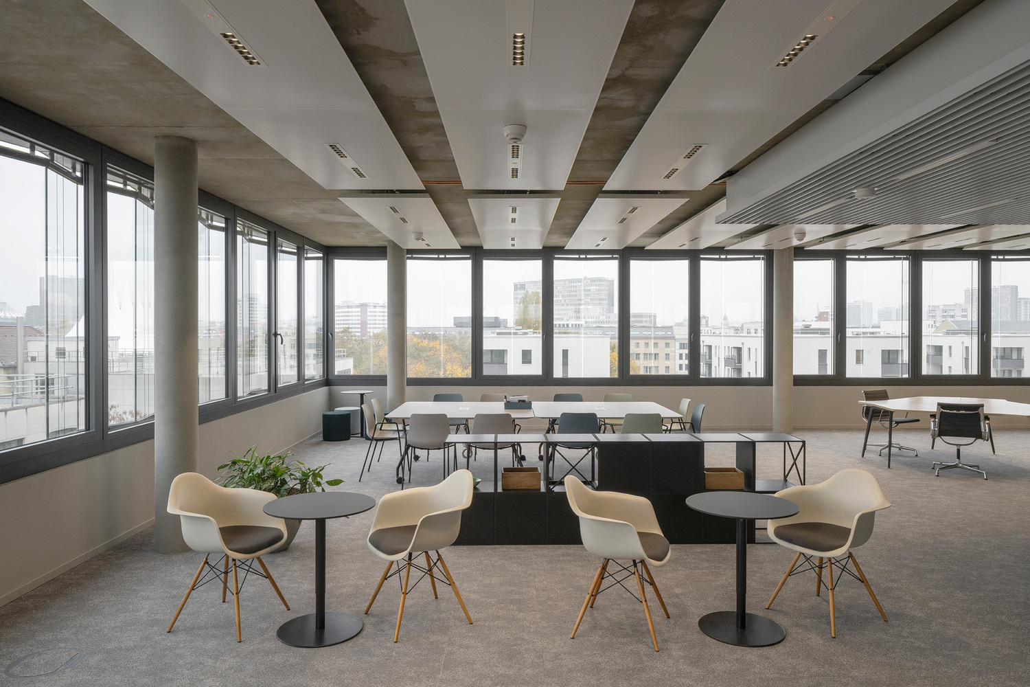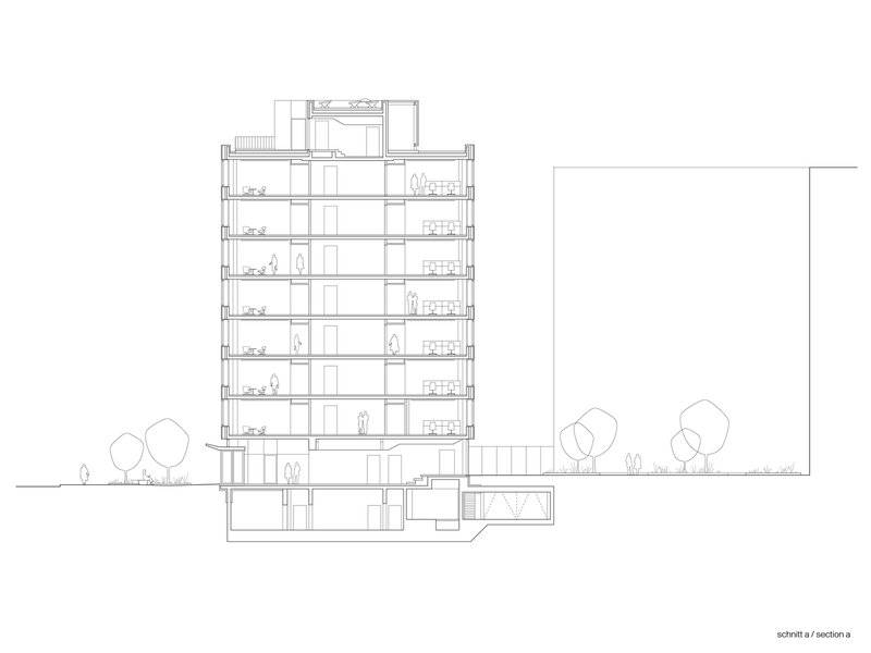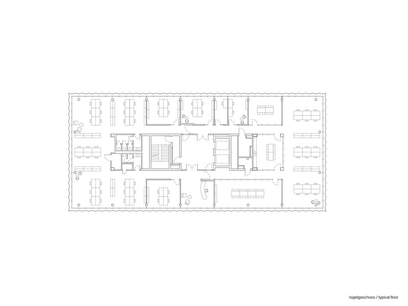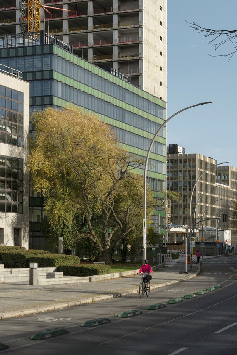 A pivotal component of the ensemble is an eight-story office building positioned along Hallesches Ufer. Together with a neighboring housing development, the building forms a shared courtyard that becomes the heart of the project. The ground floor, designed to host restaurants and retail spaces, offers transparency on all sides, visually linking the street with the landscaped interior. The flexible office spaces, organized around a compact central core and optimized structural grid, allow for adaptable layouts that support both single and multi-tenant configurations.