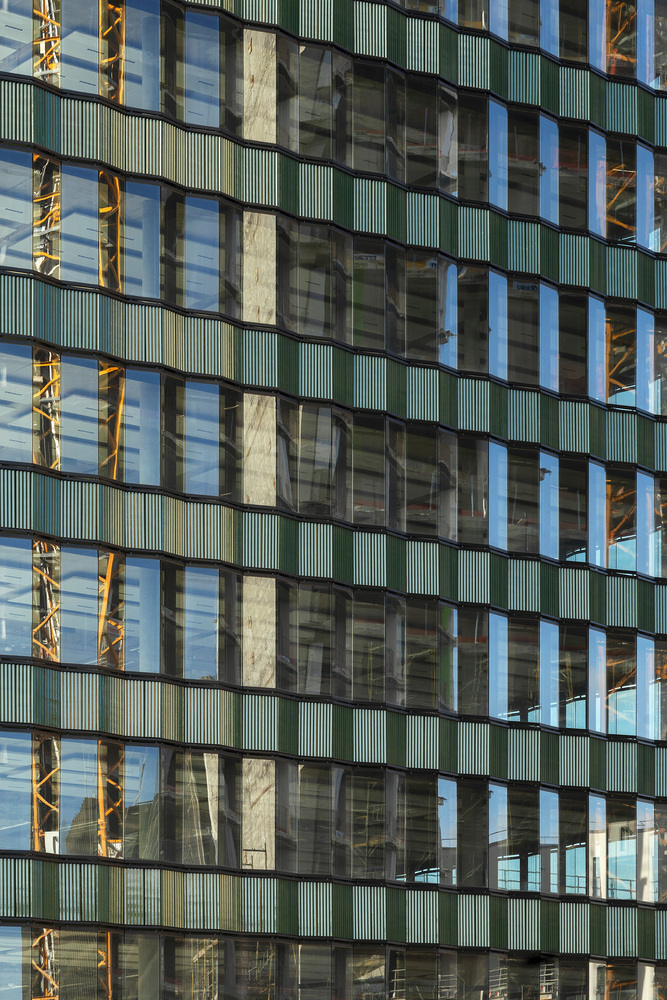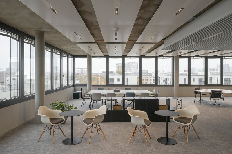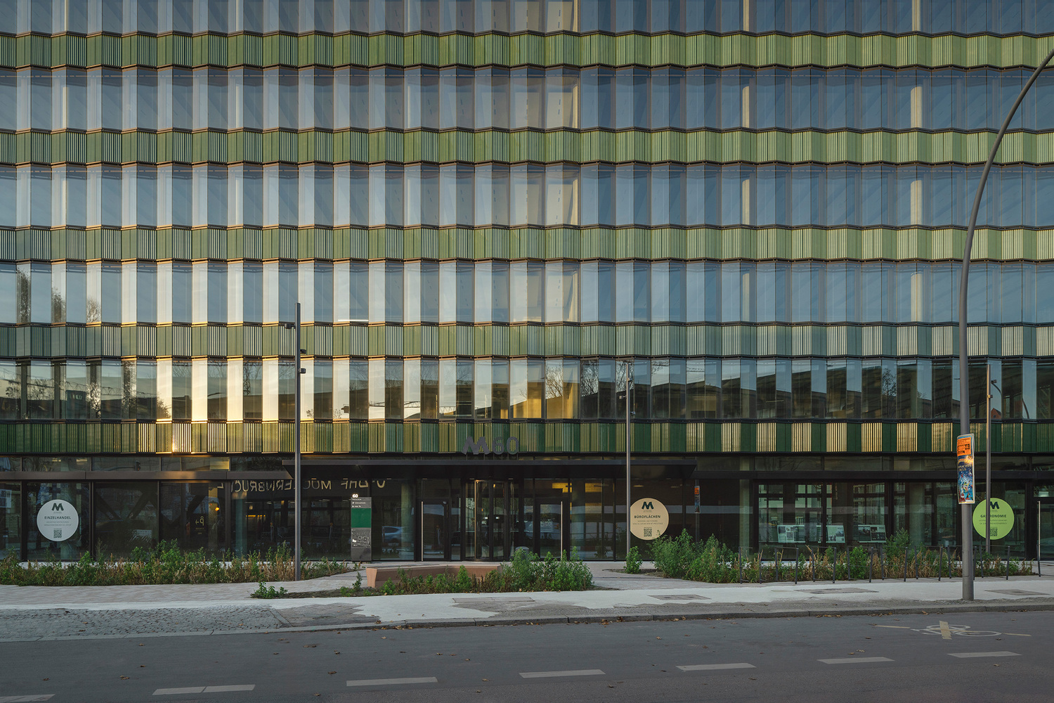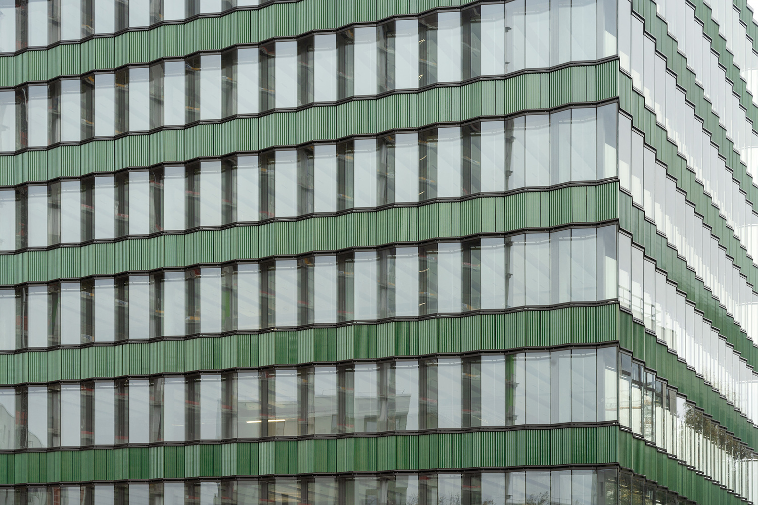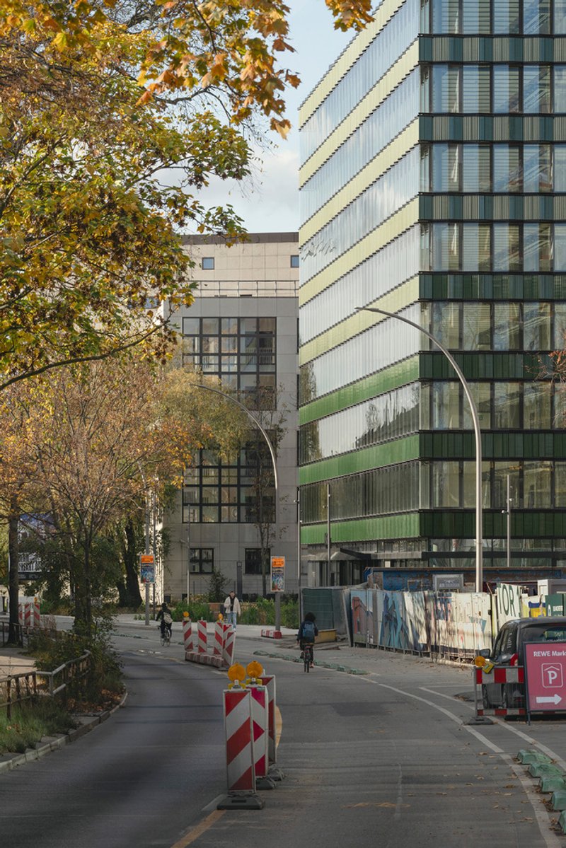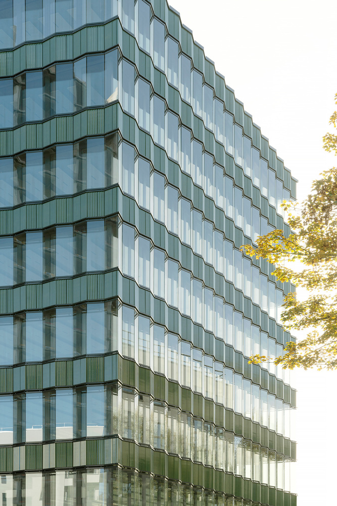 The architecture draws heavily on the industrial character of Kreuzberg, employing contoured ceramic cladding in green tones for the ribbon façade. This robust material contrasts elegantly with the delicate window bands, while subtle folds in the parapet and window panes introduce a dynamic rhythm that softens the building’s strict horizontality. As light and reflection shift throughout the day, the interplay between glass and ceramic animates the façade, ensuring a constantly evolving appearance.