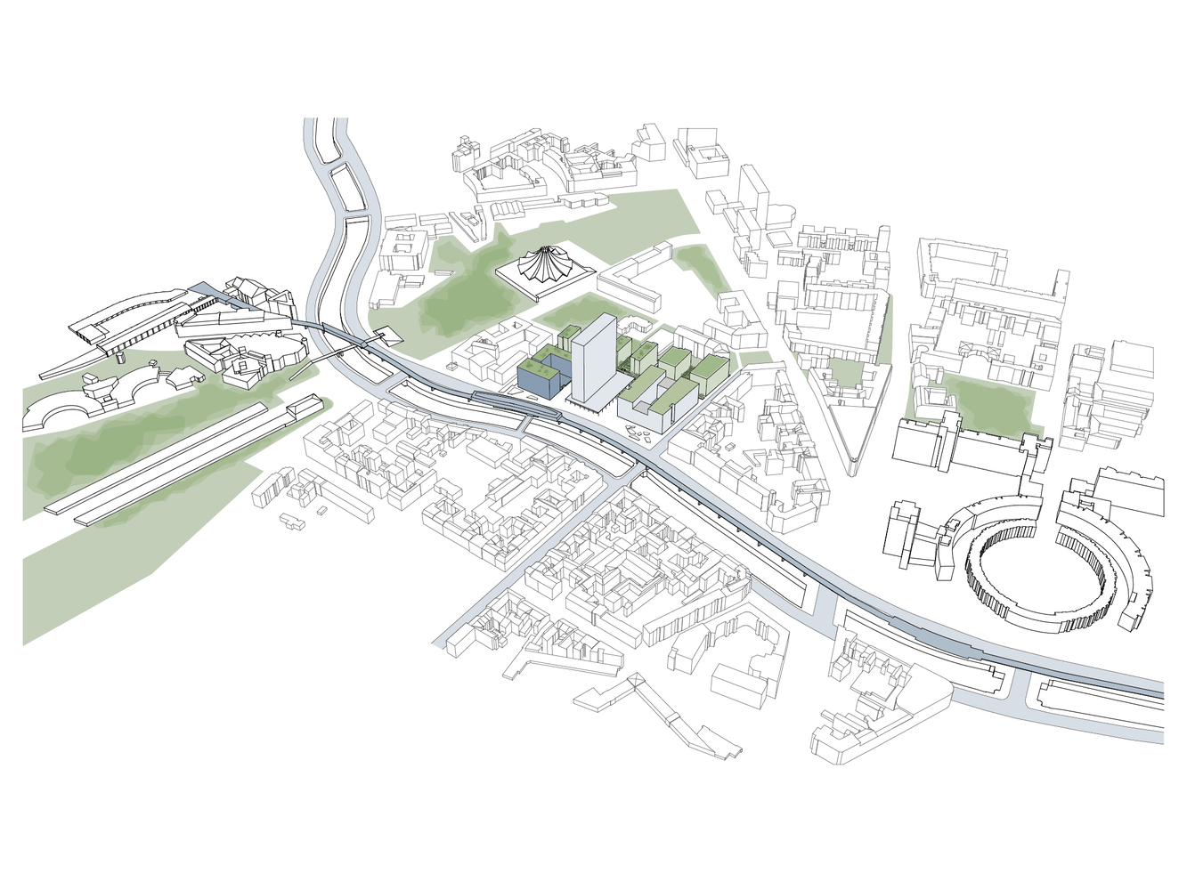 On a site once dominated by commercial activities, the new master plan unfolds as a diverse spatial weave, merging typologies and activating high-quality public spaces. The project bridges the tranquil residential zone adjacent to the park with the lively neighborhood along the canal, creating an environment that celebrates the vibrancy of Kreuzberg.