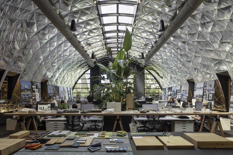 Skylab Architecture transforms 1940s industrial warehouses into an adaptive reuse office with integrated fabrication shop, fostering creativity, sustainability, and innovation.