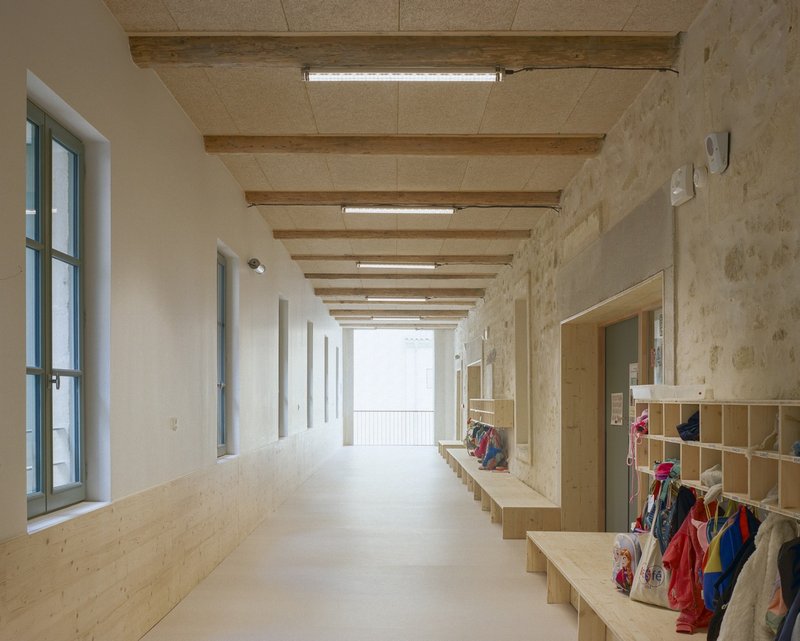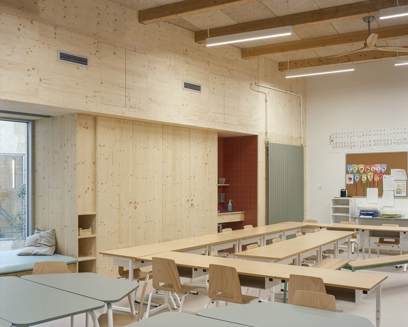 Interior materiality was handled with humility and purpose. Original stonework was uncovered to showcase craftsmanship, while concrete and wood elements were introduced to unify new learning spaces. Concrete, left raw and sandblasted, establishes clear boundaries between classrooms and circulation areas. Wood is omnipresent—used in cladding, furniture, ceilings, and flooring—offering warmth and tactile quality essential for a primary school environment.