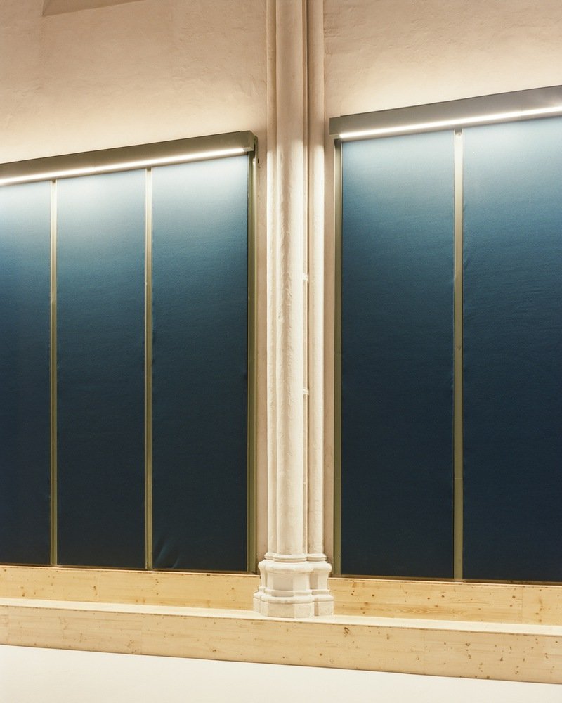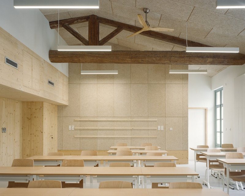 Contemporary interventions were intentionally restrained. Technical systems for heating, ventilation, and acoustics were subtly integrated using floor installations and freestanding frames with stretched fabrics. These solutions preserve the building's massing and rhythm, allowing its heritage character to remain visually dominant while supporting modern school requirements.