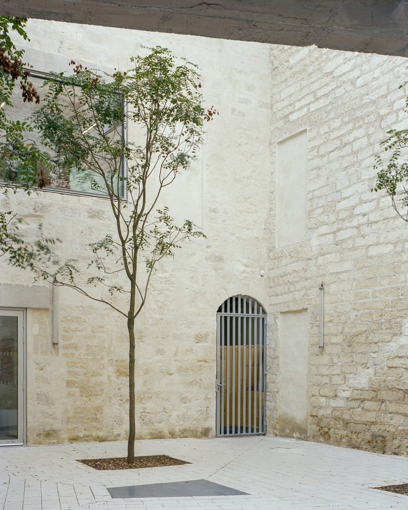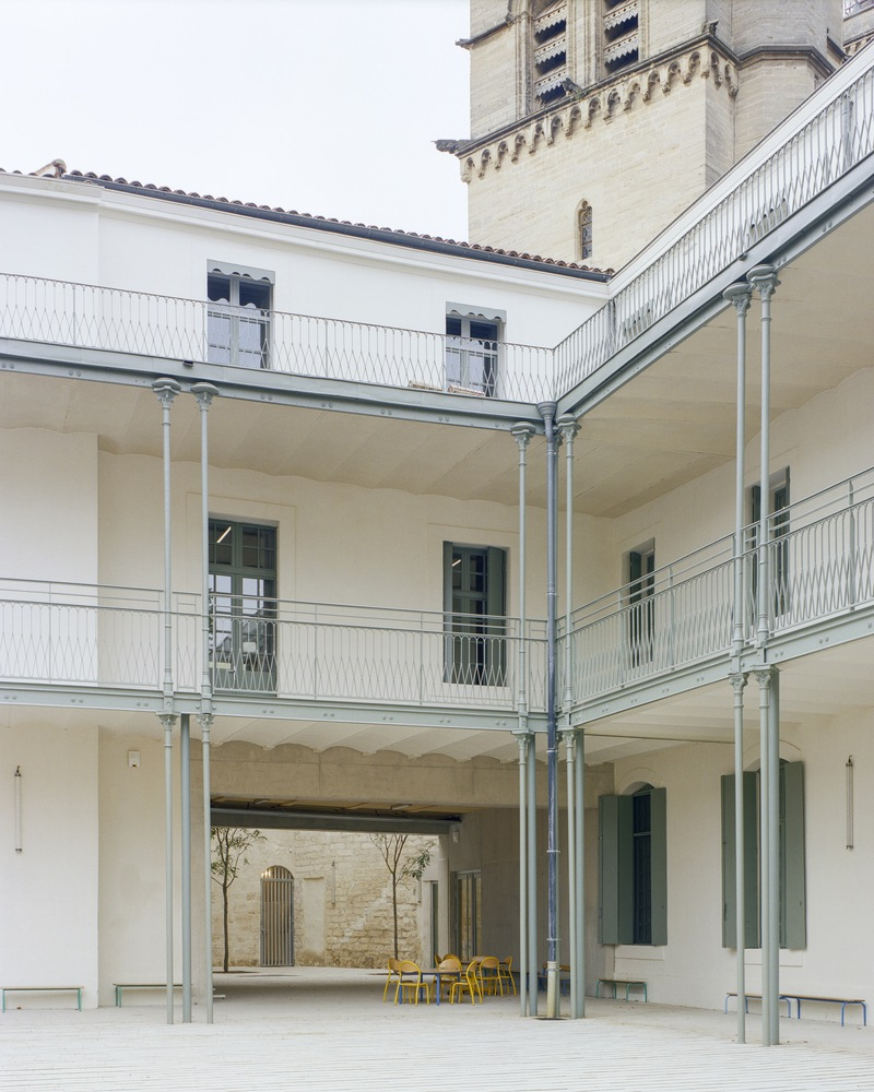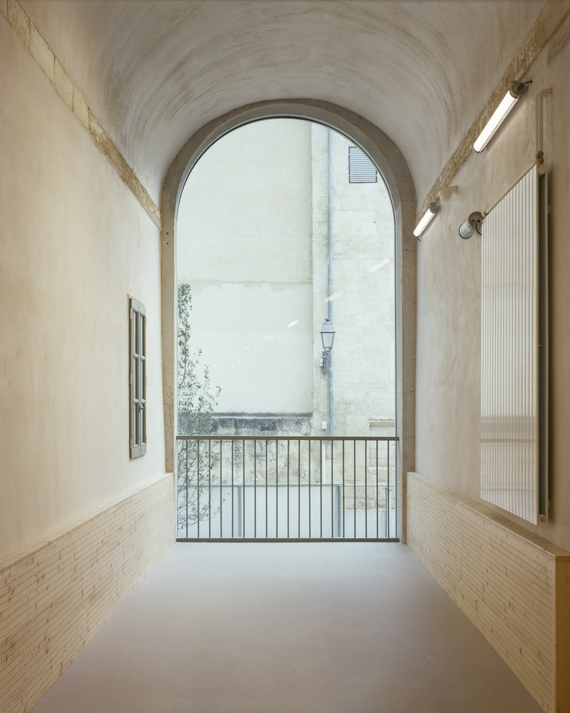 Framing views of Montpellier’s historic cityscape and neighboring institutions like the National School of Dramatic Arts, these openings also position the school as an integrated part of the urban fabric. Large-scale aluminum windows provide generous illumination while maintaining the architectural integrity of the heritage walls.