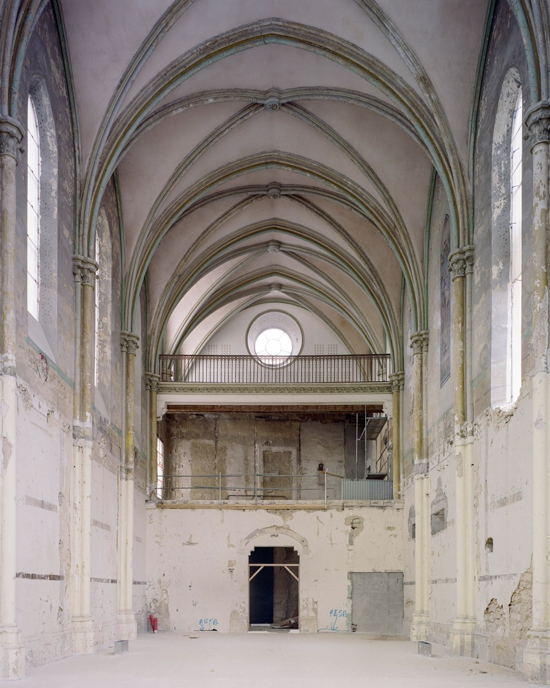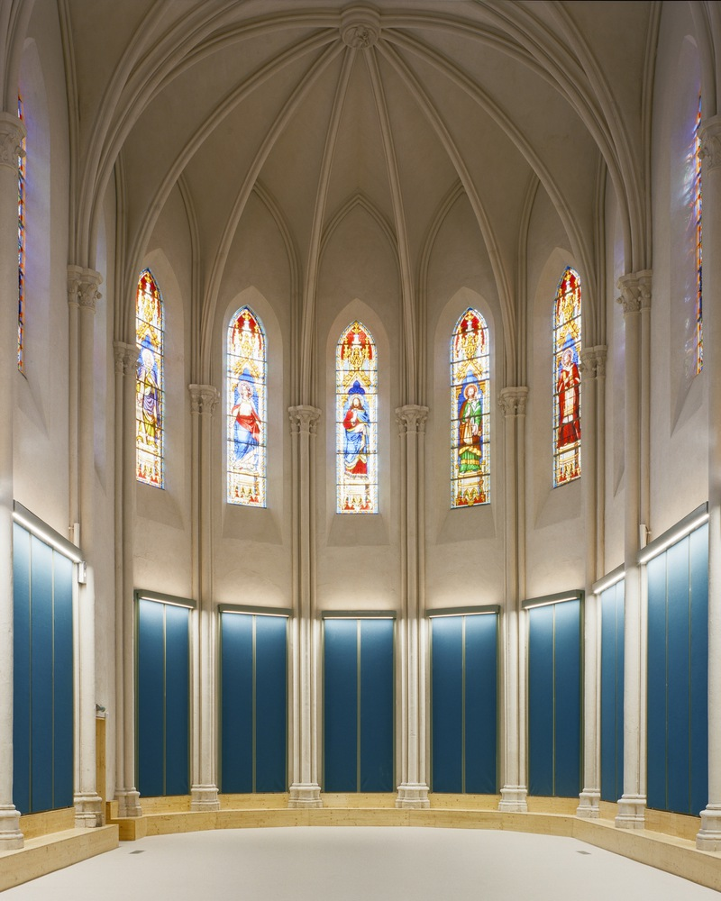 The chapel, originally built in 1857 in a neo-Gothic style by architect Nulma Polge, had been compromised by insensitive alterations during the 1990s. The rehabilitation removed intrusive mezzanines and restored the chapel’s volume. Instead of concealing the building’s layered history, the architects treated the space uniformly with lime-coated fabrics and restored stained-glass windows using traditional methods. The former sacred space now serves as a multipurpose activity room—blending secular educational functions with historical reverence.