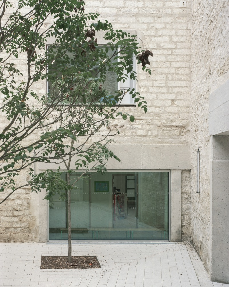 A newly revealed courtyard now anchors the primary school, referencing the original layout of the Hôtel de Brissac and the Grand Courtyard of the Ursuline convent. This spatial reconfiguration does more than celebrate history—it directly enhances the children’s daily experience through improved natural ventilation and a serene, light-filled environment.