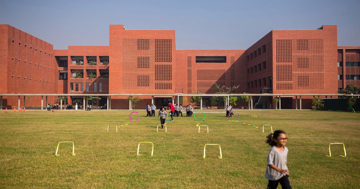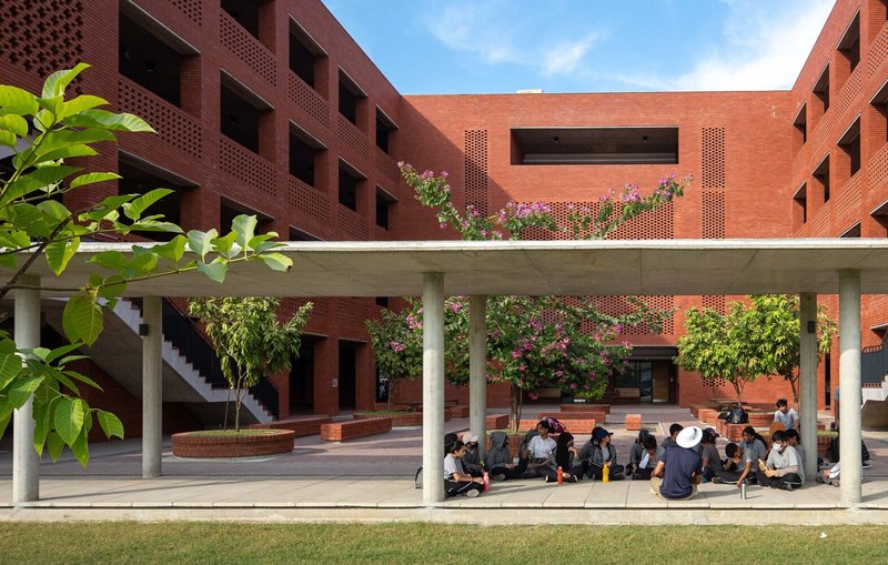 At the core of the campus lies the Maidan, a large central green inspired by historical courtyards in Buddhist monastic architecture. It functions not just as a gathering space but as a spiritual and visual anchor, promoting contemplation and community. Surrounding it are various academic buildings that frame smaller, age-specific courtyards designed with precise climatic and social intent.