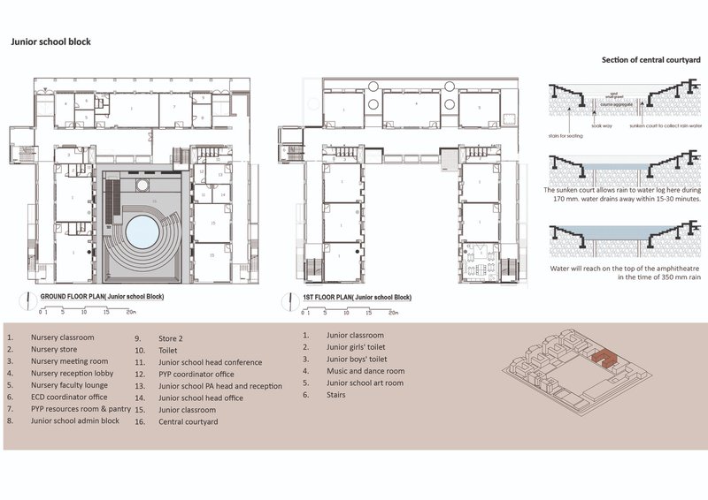 Sustainability at the Aga Khan Academy goes beyond material choices. The site integrates landscape and architecture to reinforce environmental awareness among students. A sand pit within the amphitheater transforms into a temporary pond during monsoon rains, encouraging children to celebrate the seasonal rhythm of water. Such spatial narratives encourage playful, immersive learning and deepen respect for natural processes.