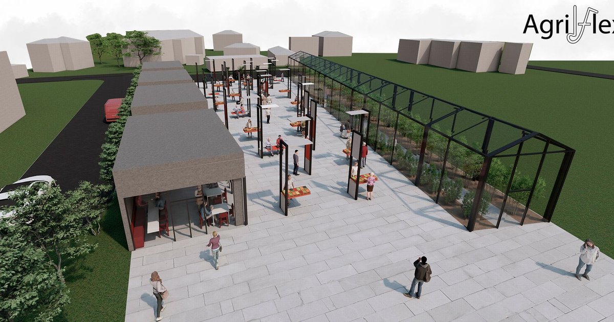 Located in Roeselare, Belgium, AgriFlex sits at the intersection of farmland and city blocks, bridging two distinct ecosystems. The design is organized along a linear axis, where transparent greenhouses represent natural agricultural production on one side, while urban-style functional modules — including a café, workshops, and restrooms — line the other. Between these two wings lies an open, adaptable marketplace that transforms into a lively public plaza.