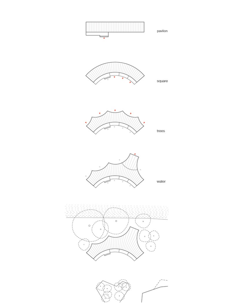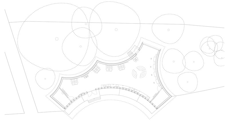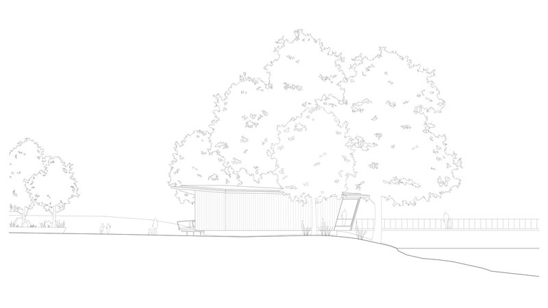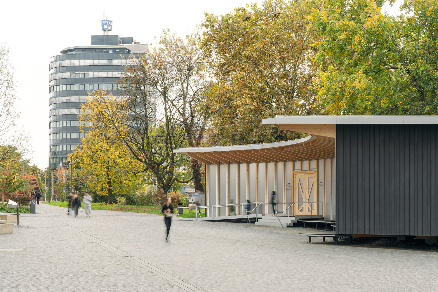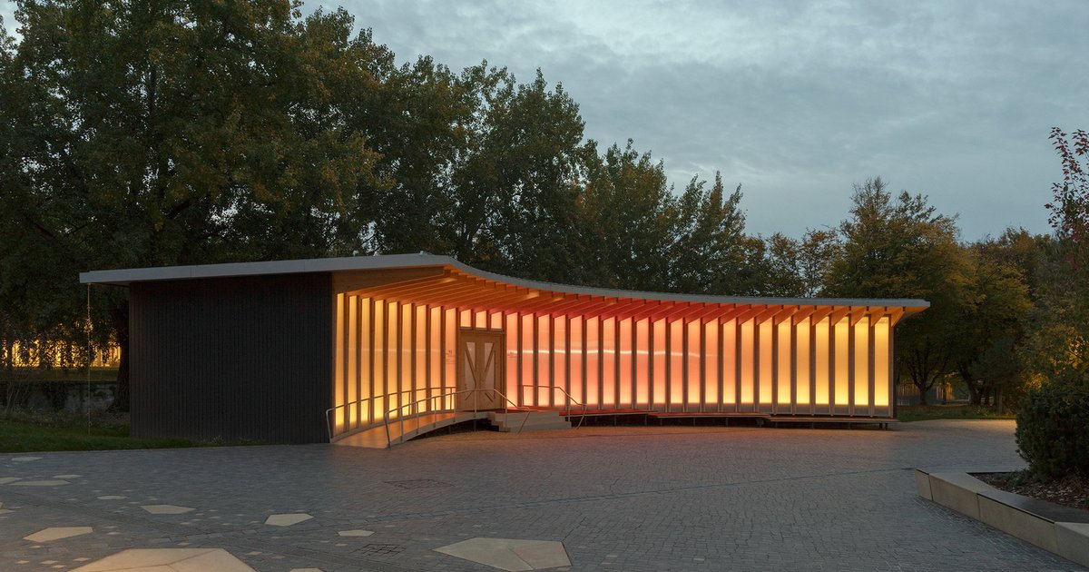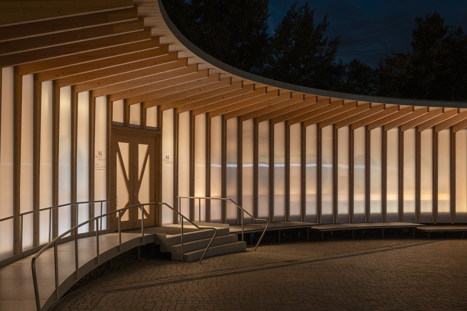 Located on Heilbronn's Kraneninsel, the AI Pavilion completes the urban composition defined by the Hagenbucher warehouse, the Experimenta extension, and the Neckar riverbank. The curved façade elegantly closes the west side of Experimenta square, creating a seamless dialogue between the natural and built environment. Under a light canopy, stepped platforms invite visitors to gather, making the building a contemporary reinterpretation of the ancient 'stoa' — a place of knowledge exchange and social interaction.