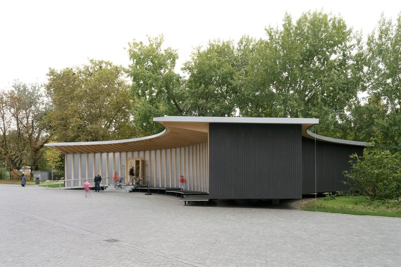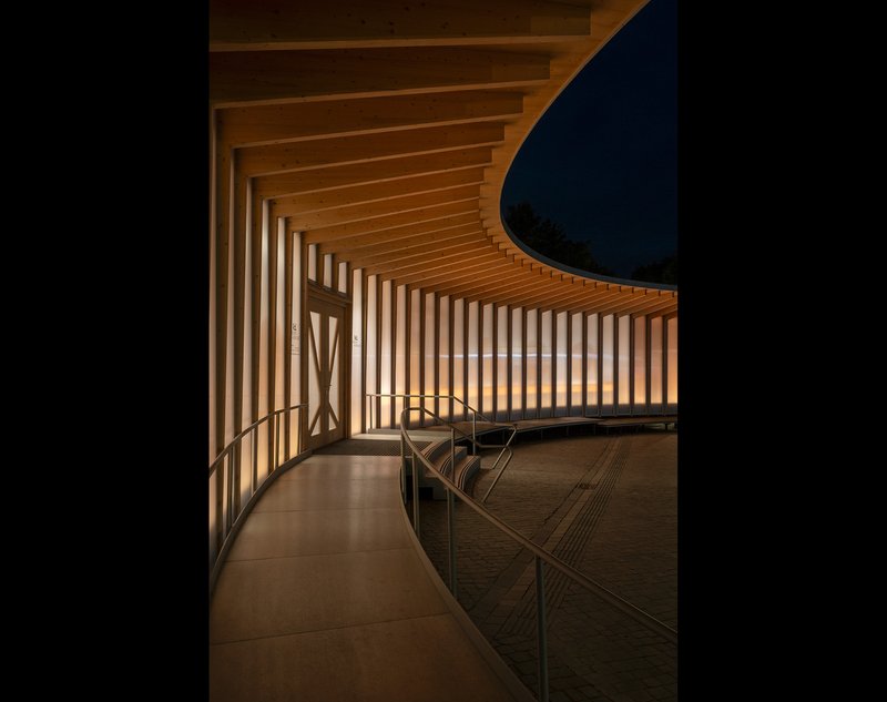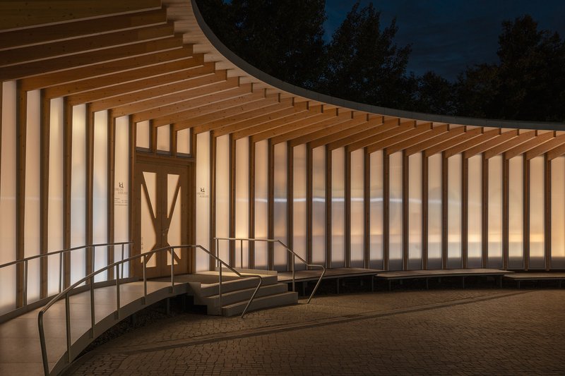 The AI Pavilion is a showcase of sustainable architecture. Sauerbruch Hutton employed a lightweight, prefabricated timber system to construct the building efficiently and with minimal environmental impact. The floor slab, ceiling, and curved wall elements are made of cross-laminated timber, supported by glued laminated timber T-supports. The façade consists of identical polycarbonate panels, emphasizing the pavilion’s temporary nature.