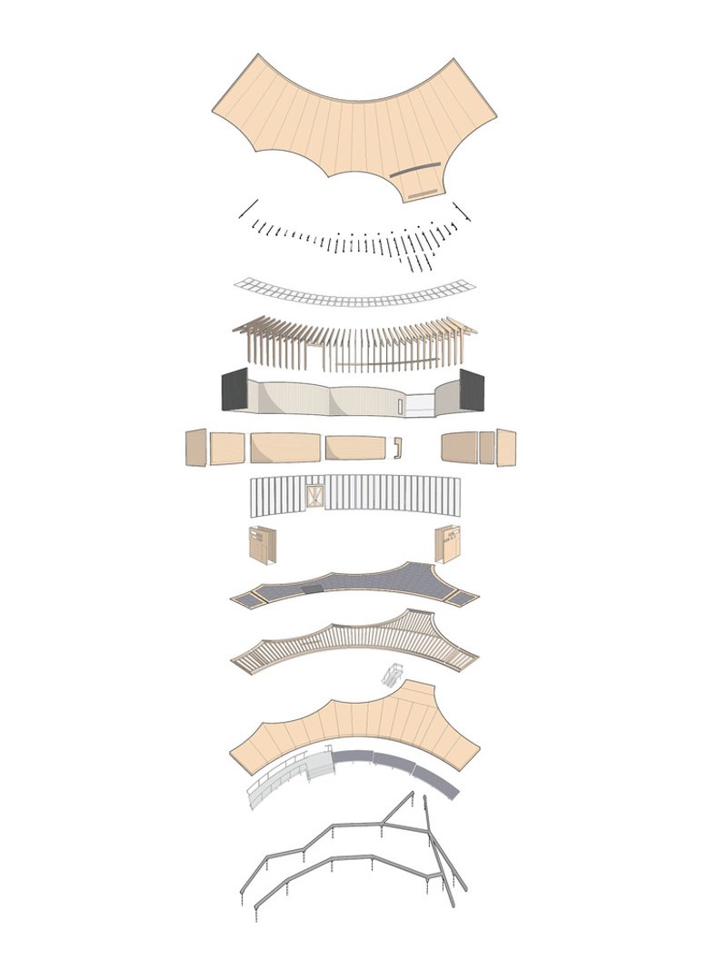 Crucially, all structural connections can be dismantled and reassembled, allowing the building to be relocated or parts to be replaced as needed. The use of renewable wood stores CO2, while the lightweight materials and prefabrication reduce resource consumption and enhance recyclability. This design not only minimizes waste but also embraces an aesthetic of natural aging and impermanence, pointing to a new vision of sustainable architecture.