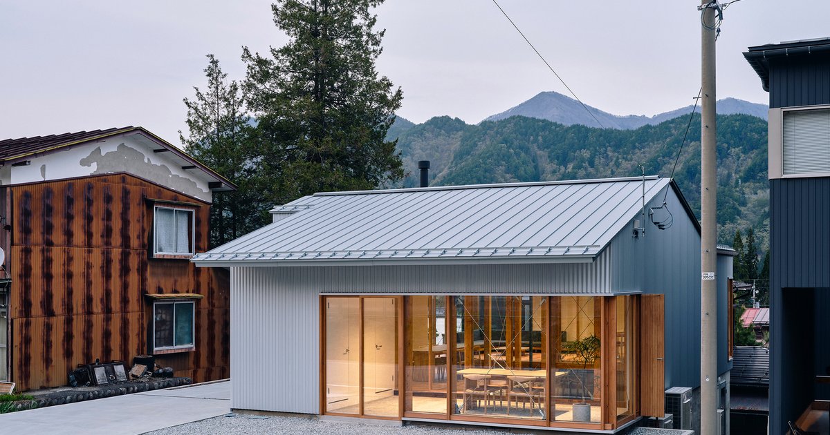 In Hida City's depopulating Kamioka district, a corrugated metal renovation fuses timber craft with industrial frankness for a forestry company.