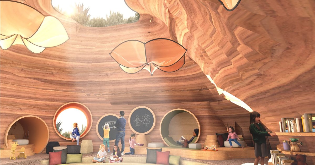 A signature component of Alluvium is its childcare environment, conceived as a playful extension of the desert’s natural rhythms. Children learn through crawling, climbing, and navigating purposefully sculpted forms inspired by geology and ecological patterns.