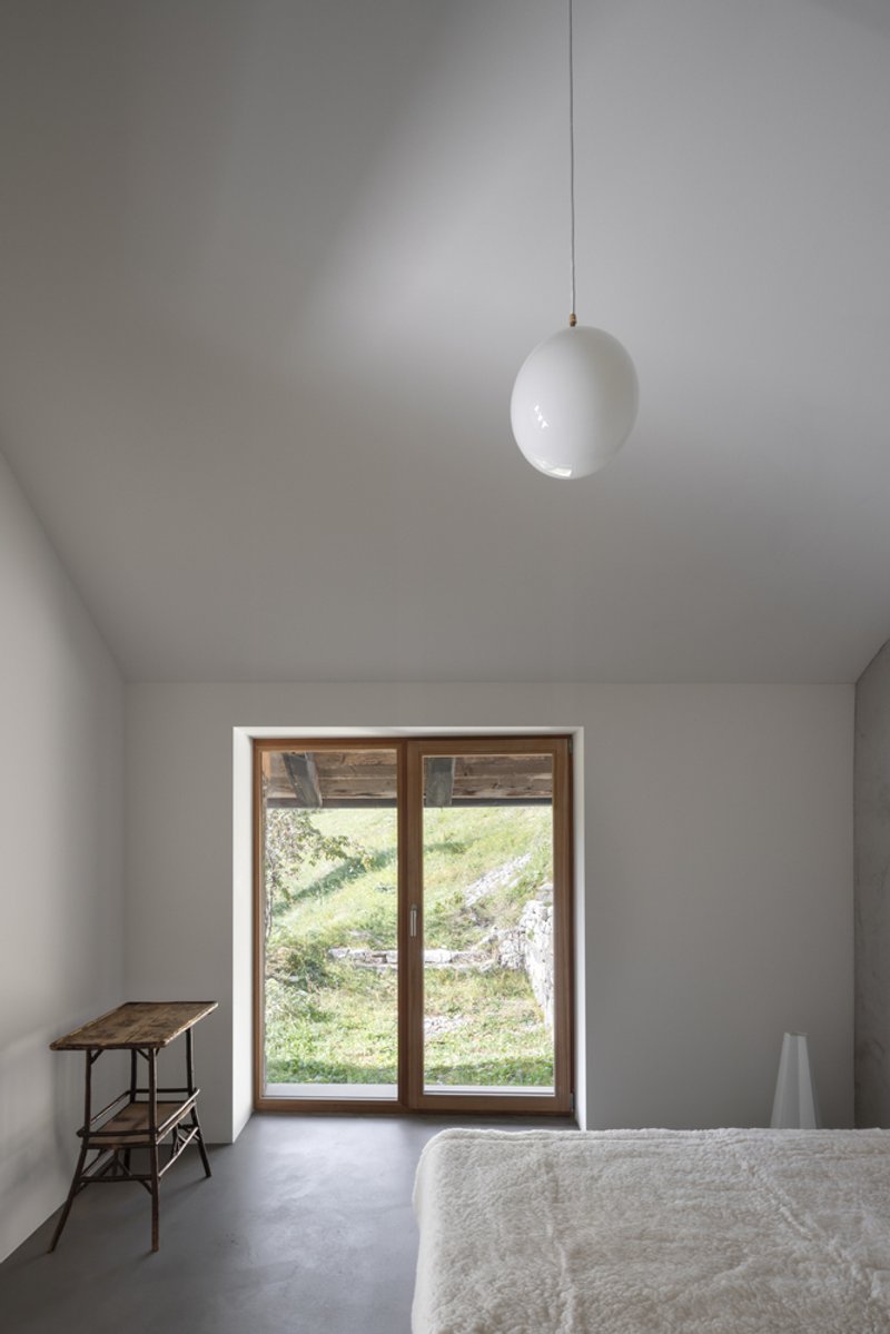 Originally constructed in 1830, the stone barn once served cattle farming and cheese production, embodying the vernacular typology of Swiss mountain pasture buildings. Today, it stands as a carefully restored alpine chalet that balances traditional craftsmanship with minimalist contemporary architecture.