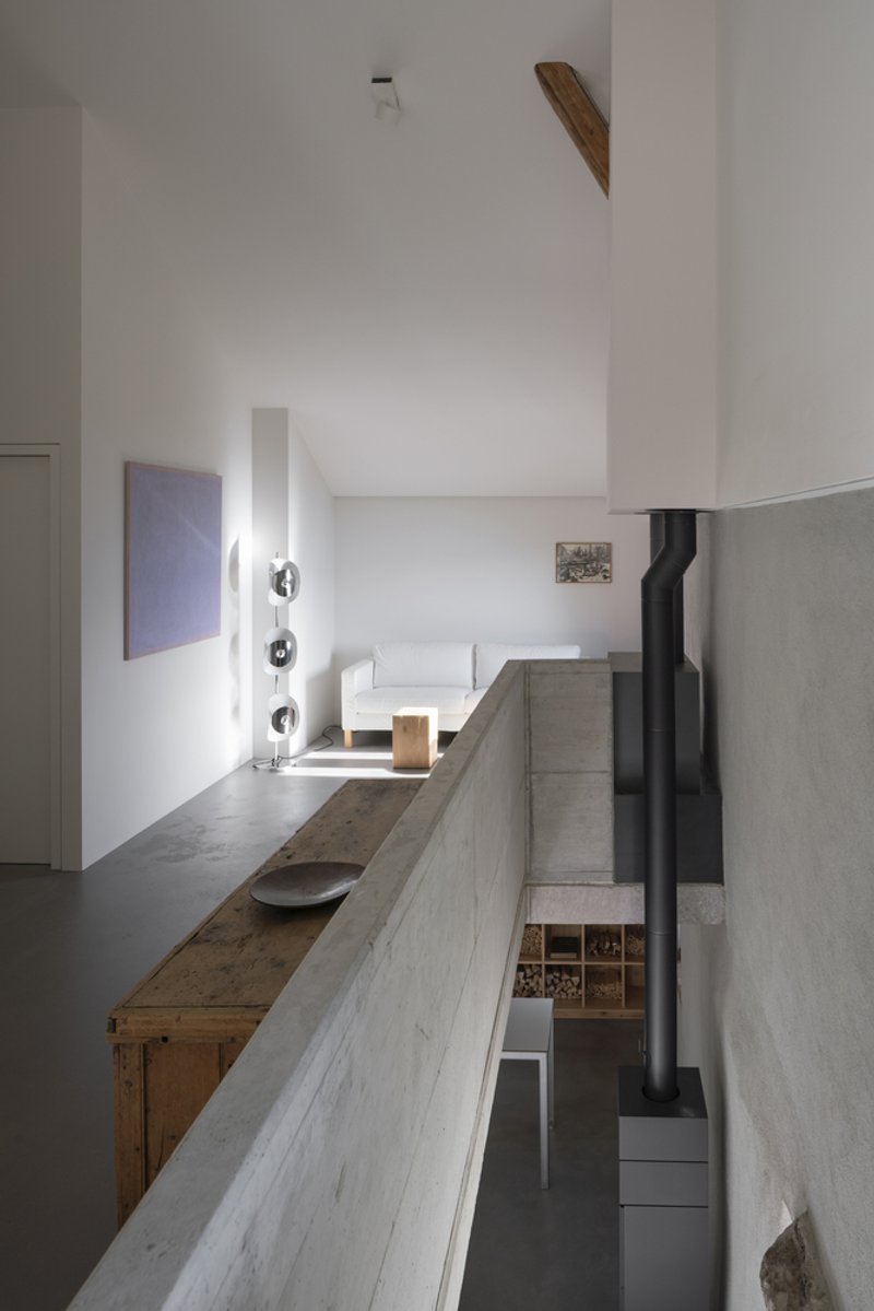 The original rural building featured thick stone masonry walls and a traditional wooden tile roof—characteristic elements of the region’s historic alpine architecture. Rather than erasing its past, the renovation strategy focused on preserving and revealing these historic layers.
