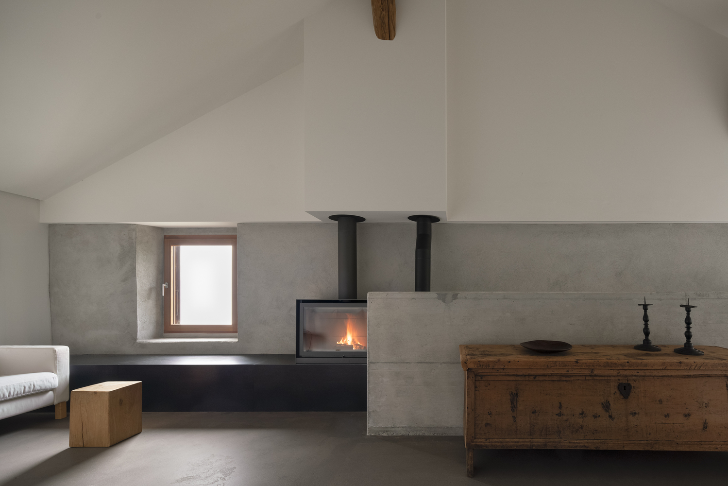 In keeping with its rural identity and environmental context, the chalet is heated exclusively by wood. A fireplace on the upper floor and a wood-burning stove on the lower level provide efficient, localized heating while reinforcing the sensory atmosphere of alpine living.