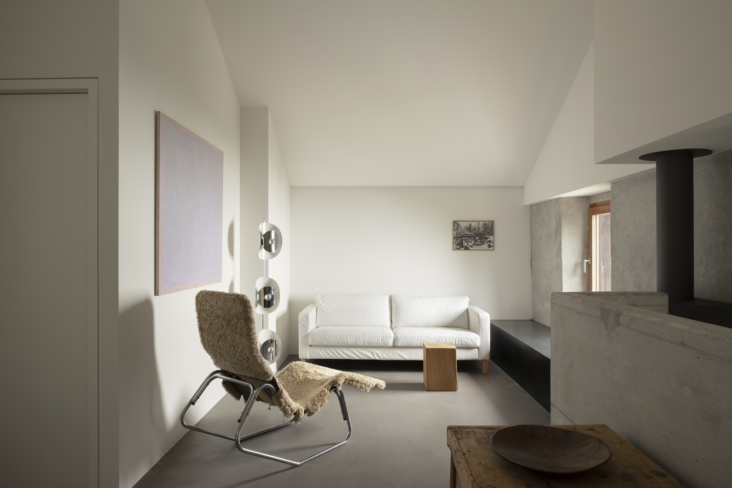 The window also introduces soft, diffused natural light, enhancing the neutral material palette and highlighting textures throughout the space. By blurring the boundary between inside and outside, the project aligns with contemporary alpine architecture strategies that prioritize environmental integration and experiential living.