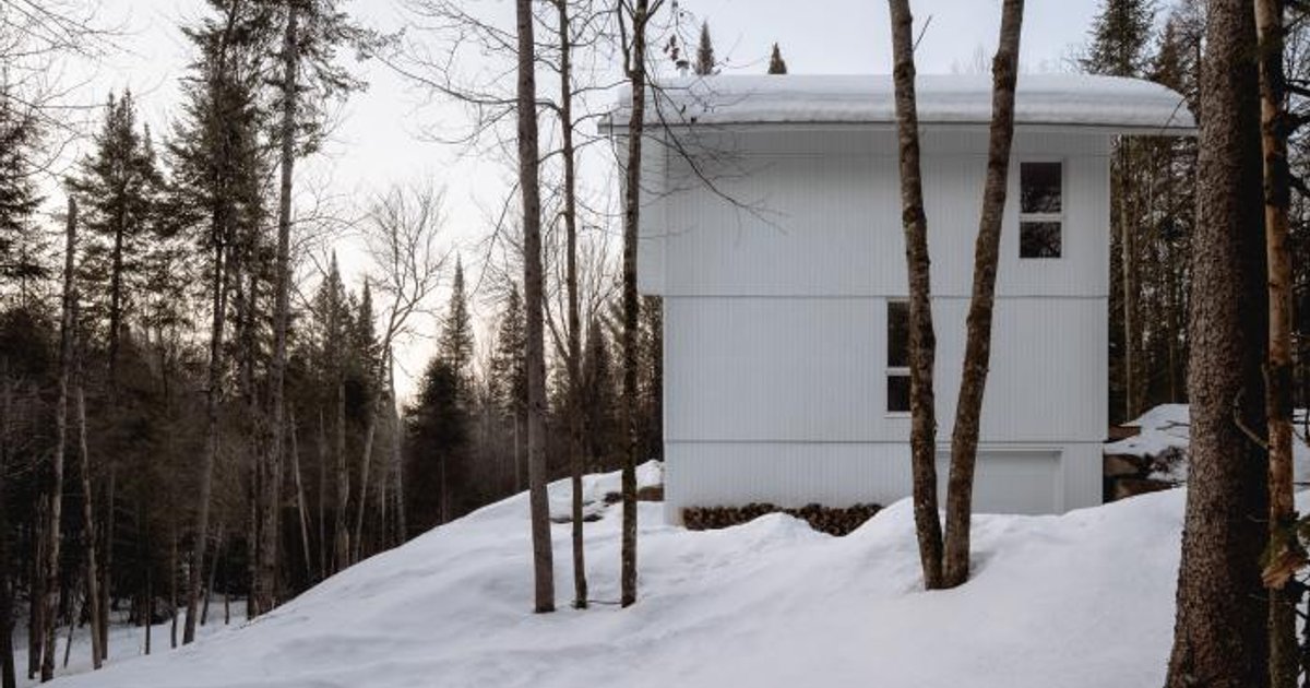 The chalet's exterior boasts white wood cladding, arranged vertically to effortlessly merge with the winter landscape. Horizontal subdivisions pay homage to traditional alpine huts, complemented by a double-pitched roof and generous overhangs. Inside, a tranquil and inviting atmosphere prevails, bathed in natural light streaming through expansive bay windows. The living area, centred around a cosy woodstove, beckons relaxation, while the master bedroom offers a dedicated reading nook. Adding to its allure, the house features bespoke furniture meticulously crafted by Inat, a Montreal-based woodworker.