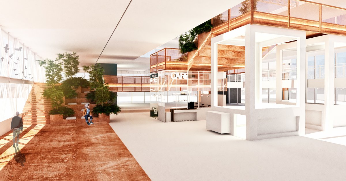 THE PROJECT AREA IS INDICATED IN YELLOW AND WE CAN SEE IT IS ADJACENT TO THE CITY PARK.THE PROPOSAL SEEKS TO FURTHER ADAPT THE BUILDING TO THE ADJACENT CITY PARK BY WELCOMING THE VISITORS FROM THE ENTRANCE THAT ATTRACTS THE COMMUNITY WITH ITS VIBRANT ORANGE COLOR AND VEGETATION.