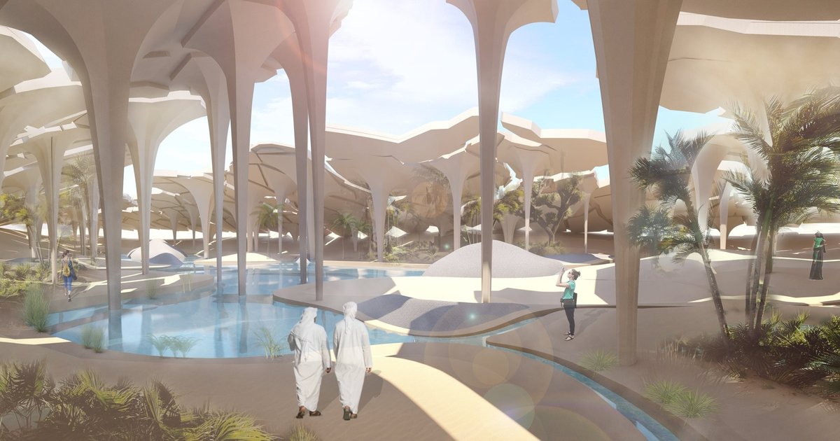 Rather than imposing an alien structure onto the desert, the pavilion emerges from it. Its cracked, carapace-like roof mimics the desiccated earth—a powerful metaphor for environmental neglect. Yet beneath this fractured surface lies a thriving micro-ecosystem of water, vegetation, and human interaction.
